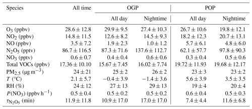 Notably, τN2O5 differed significantly between the OGP and POP: the nocturnal mean lifetime was 17.0 ± 17.0 min in the OGP, compared to 11.6 ± 6.8 min in the POP – a ∼5-min reduction. This difference is primarily driven by variations in N2O5 concentrations (rather than P(NO3), which was similar between periods: OGP nocturnal P(NO3)=0.5± 0.2 ppbv h−1; POP = 0.5 ± 0.3 ppbv h−1).