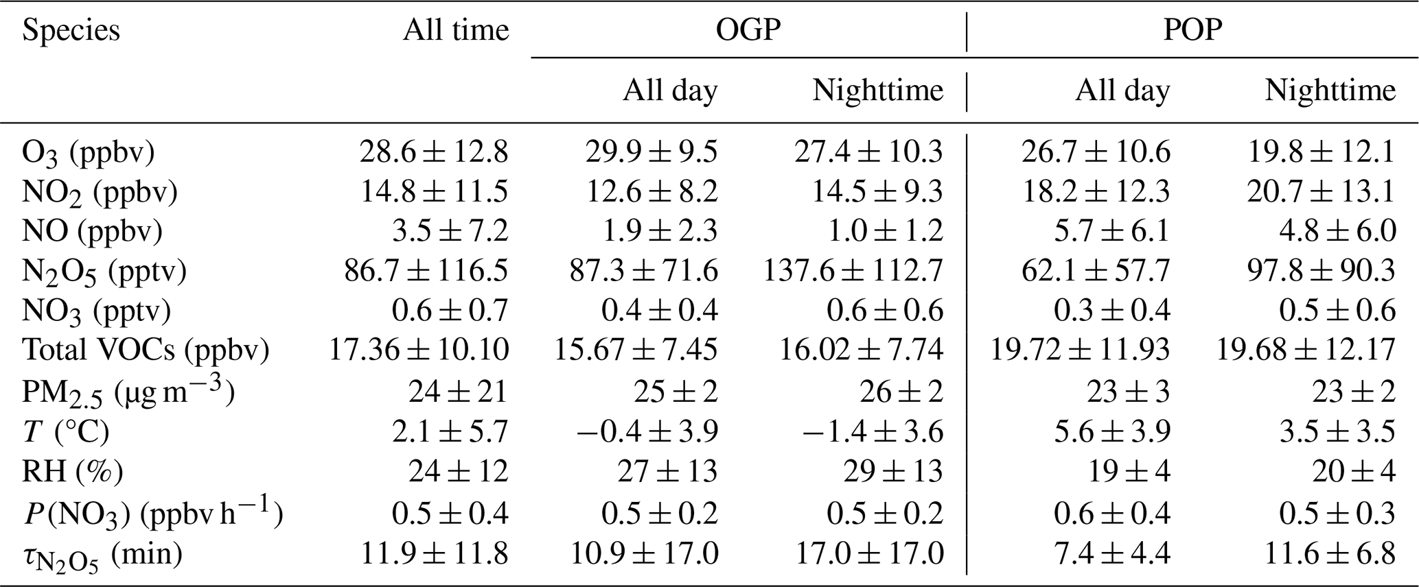 Nocturnal decline: After the 20:00 LST peak, N2O5 and NO3 concentrations gradually decreased in the OGP, falling to near-detection limits by sunrise (07:00 LST). The POP, however, showed a steeper decline between 02:00–04:00 LST: N2O5 dropped from 94.1 to 61.8 pptv, and NO3 from 0.6 to 0.3 pptv – attributed to elevated nocturnal NO emissions in the POP (peaking at 9.9 ppbv at 04:00 LST) that accelerate NO3 loss.