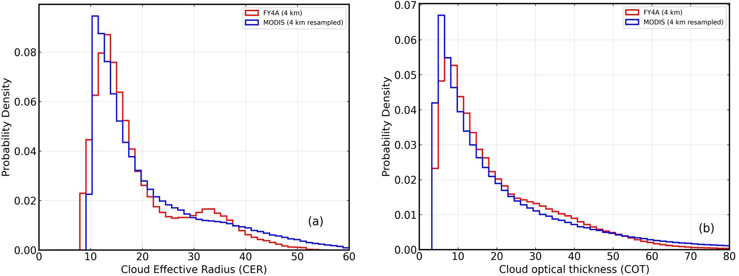 Figure 5 display the probability density distributions (PDFs) of CER and COT generated from the same 4 km resampled data to ensure consistency with Fig. 4. These PDFs provide a basis for comparing the retrievals between FY4A/AGRI and MODIS. The results indicate that FY4A/AGRI underestimates CER relative to MODIS for CER < 13 µm, while it tends to retrieve larger CER values in the range of 14–23 µm. A similar trend is observed in COT, with MODIS yields higher values for COT < 10 and FY4A/AGRI higher values at larger COT. These differences are mainly attributable to sensor resolution and the partial filling effect, whereby coarse pixels contain a mix of cloudy and clear areas (Chen et al., 2017; Ackerman et al., 2008; Chen et al., 2020). Overall, the distributions remain consistent, supporting the robustness of the retrievals.