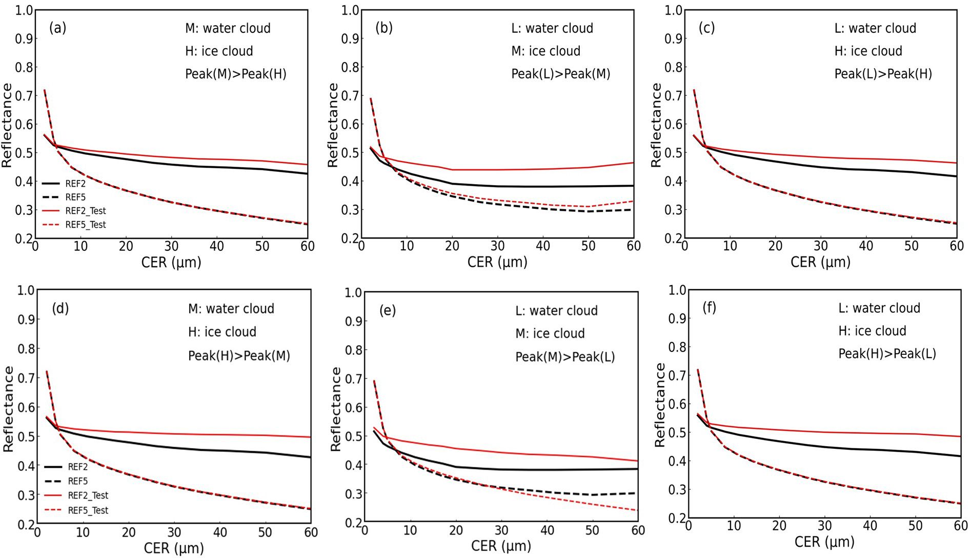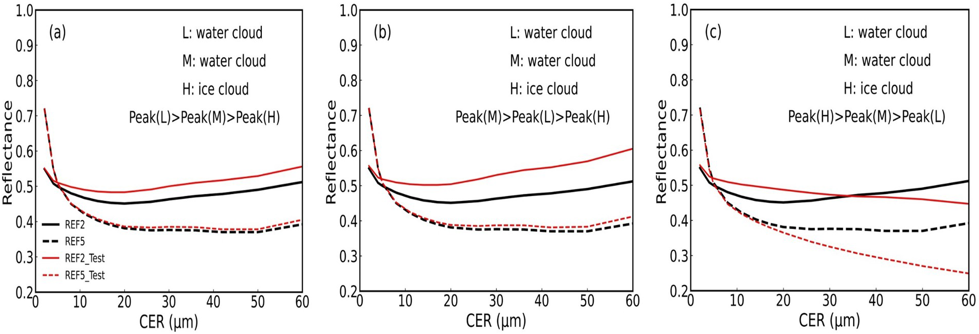 For the three-layer clouds consisting of high-level ice cloud over mid-level water cloud over low-level water cloud, increasing either low- or mid-level CWC enhances Channel 2 reflectance with increasing CER, with the increase being more pronounced for mid-level CWC (Fig. 10a–b). The response of Channel 5 reflectance exhibits a similar trend but with a smaller magnitude, indicating that the mid-level water cloud contributes more significantly to reflectance in both channels. When high-level IWC is increased, Channel 2 reflectance decreases approximately linearly with CER, while Channel 5 also declines (Fig. 10c). For CER > 14 µm, Channel 5 reflectance drops from  0.4 to 0.25, highlighting the strong radiative shielding effect of the high-level ice cloud on underlying water clouds. These observations align with Li et al. (2011), who found that multilayer clouds have weaker shortwave reflectance than single-layer clouds due to their higher cloud tops allowing shortwave radiation to partially transmit to lower clouds or the surface.