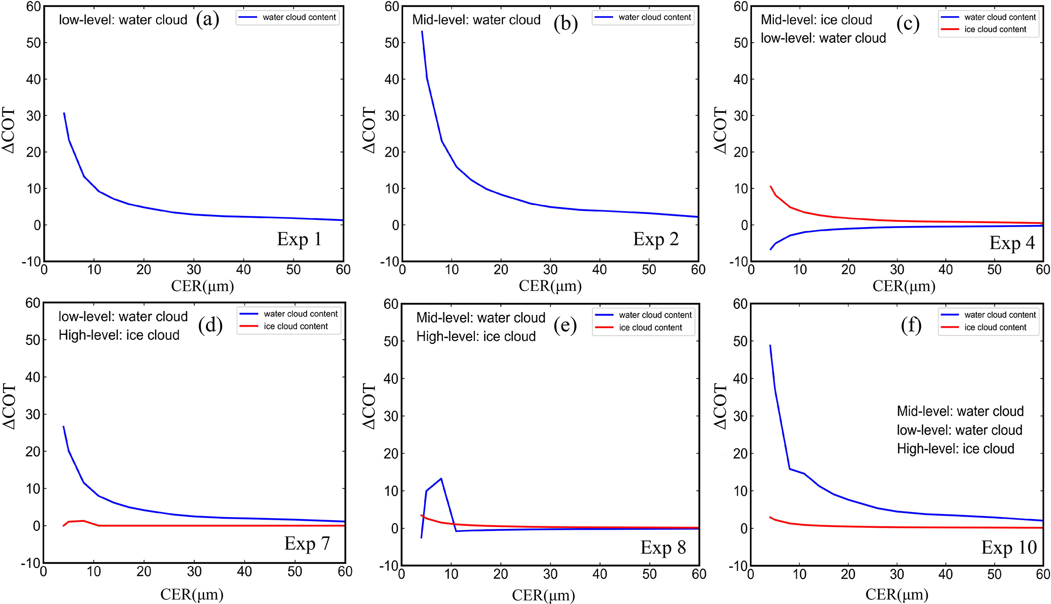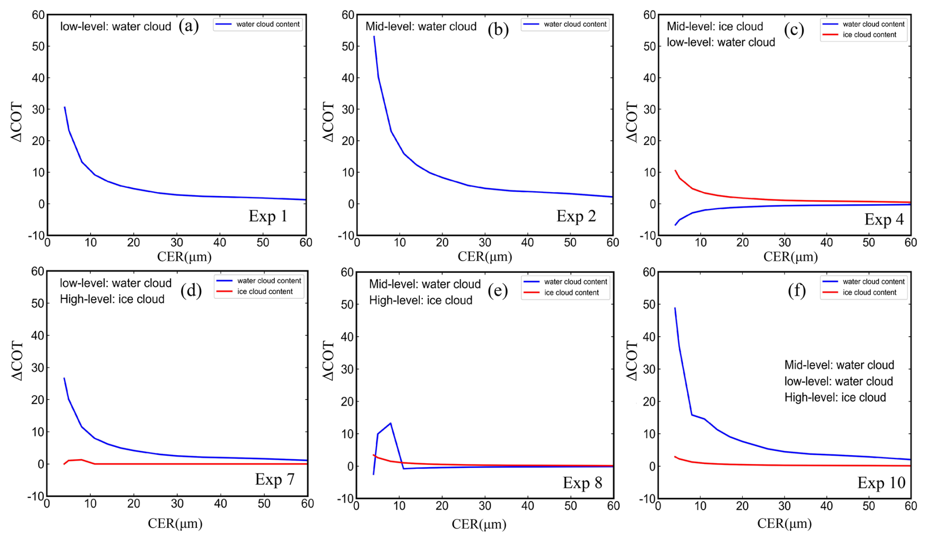 Figure 11Changes in cloud optical thickness (ΔCOT) as a function of CER for six selected vertical cloud structure types (Exp 1, 2, 7, 8, and 10). Each panel shows the ΔCOT resulting from adding CWC or IWC to a specific vertical layer relative to a reference state without that layer. Blue lines represent the contribution of added CWC, while red lines represent added IWC. Model numbers are indicated in each panel. when the solar zenith angle is 40°, the sensor viewing zenith angle is 40°, and the relative azimuth angle is 20°.