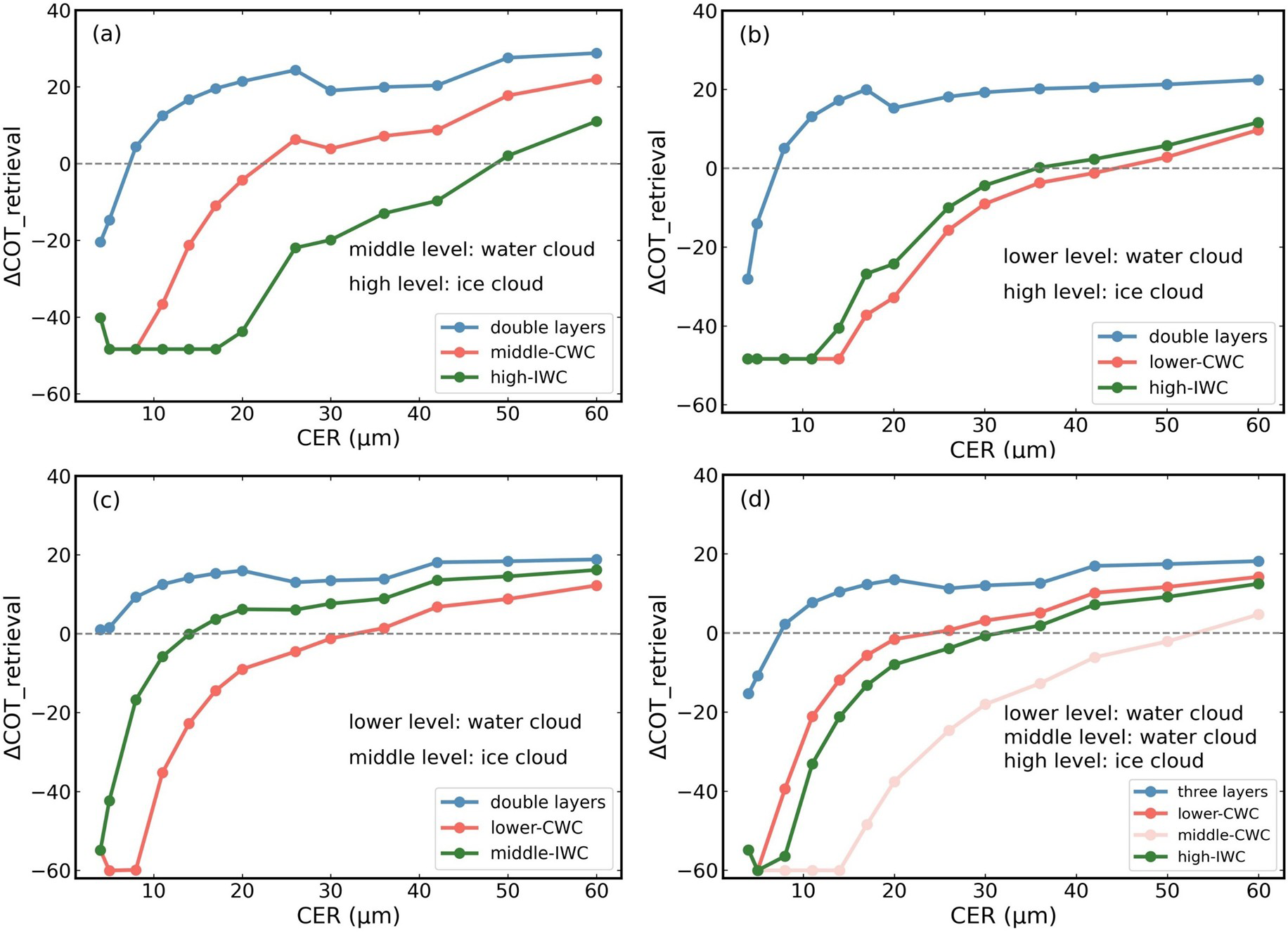 For the three-layer cloud case, increasing mid-level CWC results in single-layer retrievals being consistently smaller than the simulations when CER < 50 µm, highlighting the limitations of the single-layer assumption under complex vertical structures (Fig. 12d). Together with the preceding COT–CER analyses, these results quantitatively demonstrate that neglecting vertical heterogeneity introduces significant biases in single-layer retrievals, with both the magnitude and sign of ΔCOT_R strongly dependent on CER and the vertical distribution, thickness, and microphysical properties of water and ice layers. Importantly, the trends observed in ΔCOT_R are consistent with the reflectance sensitivity experiments, confirming the direct impact of vertical cloud structure on operational COT retrievals.