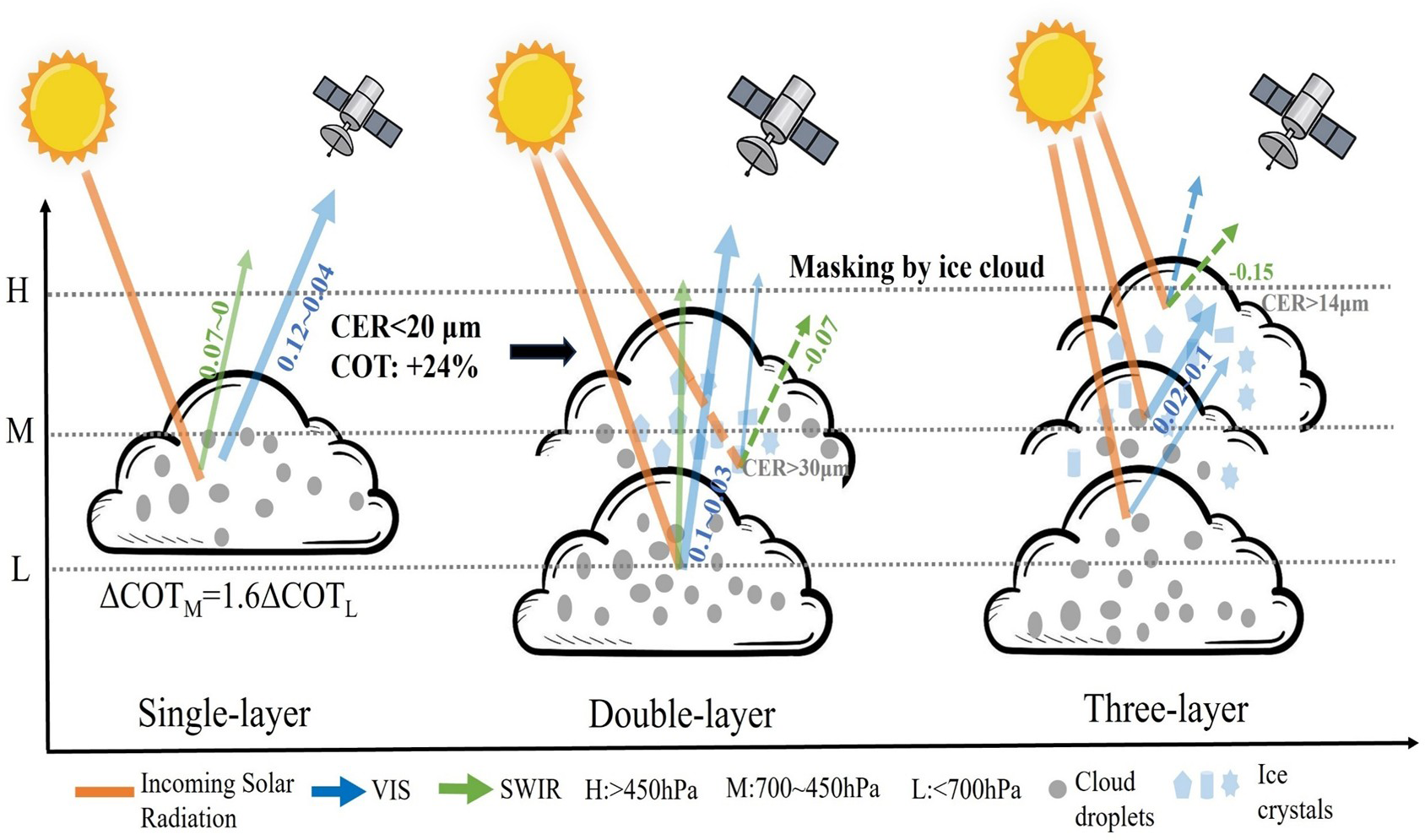 The COT and CER retrieved from FY4A/AGRI show good agreement with MODIS, confirming its reliability for analyzing the sensitivity of COT and CER to cloud vertical structure. Figure 13 presents a conceptual schematic of the radiative effects of cloud layering. Cloud reflectance in the visible and shortwave-infrared channels is influenced by CWC and IWC at different altitudes, as well as particle size. For single-layer liquid clouds, increasing low-level CWC strongly enhances reflectance, with visible channel increases about 15 % greater than those for mid-level liquid or high-level ice clouds. In two-layer clouds, the “mid-level water–high-level ice” and “low-level water–high-level ice” configurations are dominated by the upper ice cloud, while in the “low-level water–mid-level ice” configuration, increasing low-level CWC first reduces and then increases reflectance, whereas increasing mid-level IWC causes a linear decrease. For three-layer clouds, mid- and low-level water clouds contribute most to the visible channel, while high-level IWC strongly reduces reflectance through radiative shielding.