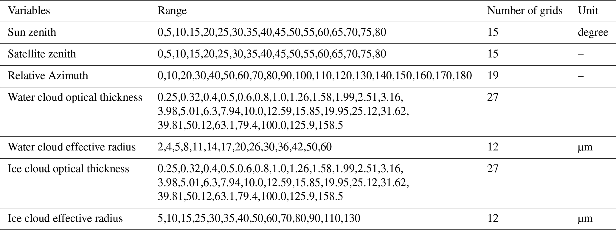 Table 2Input parameters and grid points of the variables used to build the LUT version of the FY4A/AGRI.