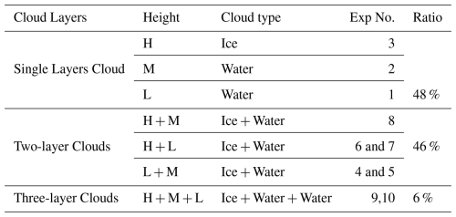 Statistical results (Table 3) show that single-layer clouds account for 48 % of the profiles, two-layer clouds 46 %, and three-layer clouds 6 %. These proportions are consistent with the findings of Xu et al. (2023), who reported that single-layer clouds dominate (55.4 %) in radiosonde observations, with two-layer systems being the most frequent among multilayer clouds. This agreement supports the validity and physical relevance of the classification method used.