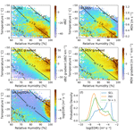 In ice supersaturated regions (Si > 1.0), the vertical gradient shows a dependence on temperature (Fig. 2c–d). The dBZ gradient is relatively larger at around 5, 15, and 25 °C compared to other temperatures, while MDV gradient is relatively lower at temperatures above 5 °C and around 15 °C compared other temperatures. Interestingly, these observed features align with the maximum mass growth rate of ice particles and their apparent density minima near 5 and 15 °C reported in vertical supercooled cloud tunnel studies (Takahashi et al.1991; Takahashi and Fukuta1988). Except for the size or density growth rate, the particle shape transition may also be a significant source of change of scattering scattering properties as revealed by simulations (Tyynelä et al.2023, and references therein). An increase in the reflectivity (dBZ) gradient and a decrease in the MDV gradient are observed around 15 °C (Fig. 2c–d), which corresponds to significant minima in MDV (Fig. 2b). These phenomena have been frequently reported in previous observations (e.g. Schrom and Kumjian2016; von Terzi et al.2022).