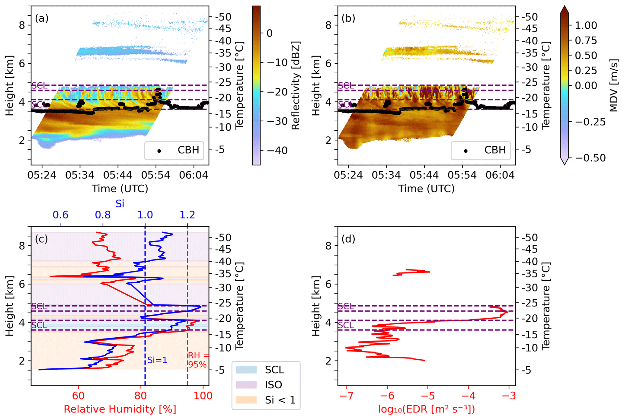 Figure 1A case on 18 February 2015 (UTC) at the NSA site. (a) Radar reflectivity (dBZ) and (b) mean Doppler velocity (MDV) from KAZR within ±15 min and 4 km of the radiosonde launch, plotted as time–height sections in UTC. (c) Radiosonde profiles of relative humidity and water vapor saturation ratio with respect to ice (Si). (d) In-cloud energy dissipation rate (EDR) from radiosonde and radar. In (a)(b), dashed purple lines mark the top and bottom boundaries of radiosonde-identified supercooled liquid water (SCL) layers; for clarity, two closely spaced SCL layers separated by a thin non-SCL interval are shown as one continuous layer. Black points denote ceilometer cloud base height (Zhang et al.2025). In (c), the vertical dashed red line marks RH = 95 % (SCL threshold), and the vertical dashed blue line marks Si = 1. Colored shadings in (c) indicate moisture regimes: blue for the SCL condition (RH > 95 %, Si > 1.0), purple for the ISO condition (RH < 95 %, Si > 1.0), and orange for the ice-subsaturated condition (Si < 1.0).