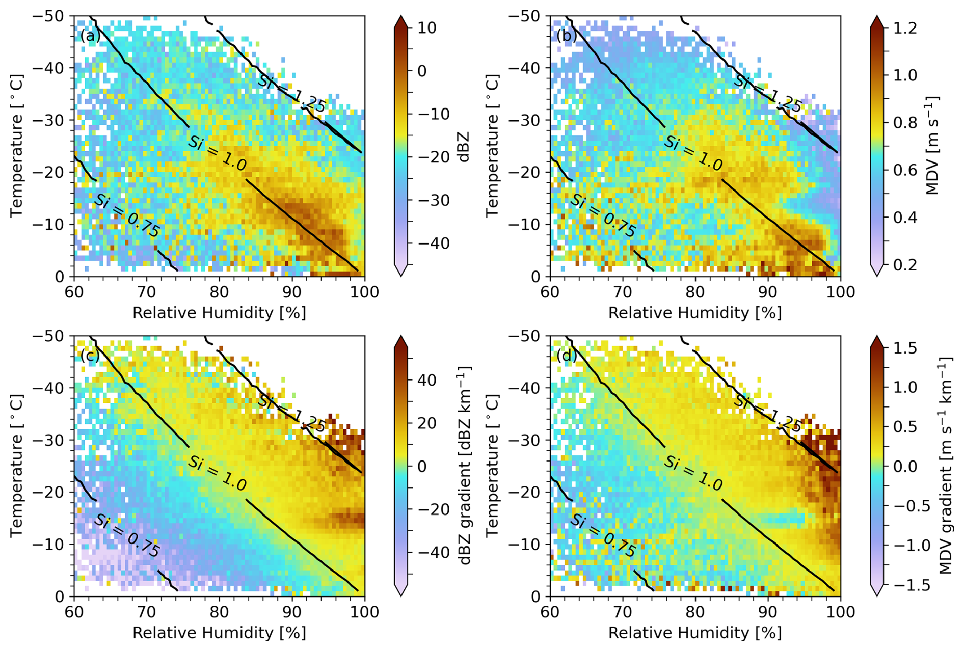 Figure 2Median values of key variables as a function of relative humidity (%) and temperature (°C), including (a) radar reflectivity, (b) mean Doppler velocity, (c) the vertical gradient of dBZ, and (d) the gradient of MDV. The black contour lines indicate different saturation levels with respect to ice (Si = 1.25, 1.0, and 0.75).