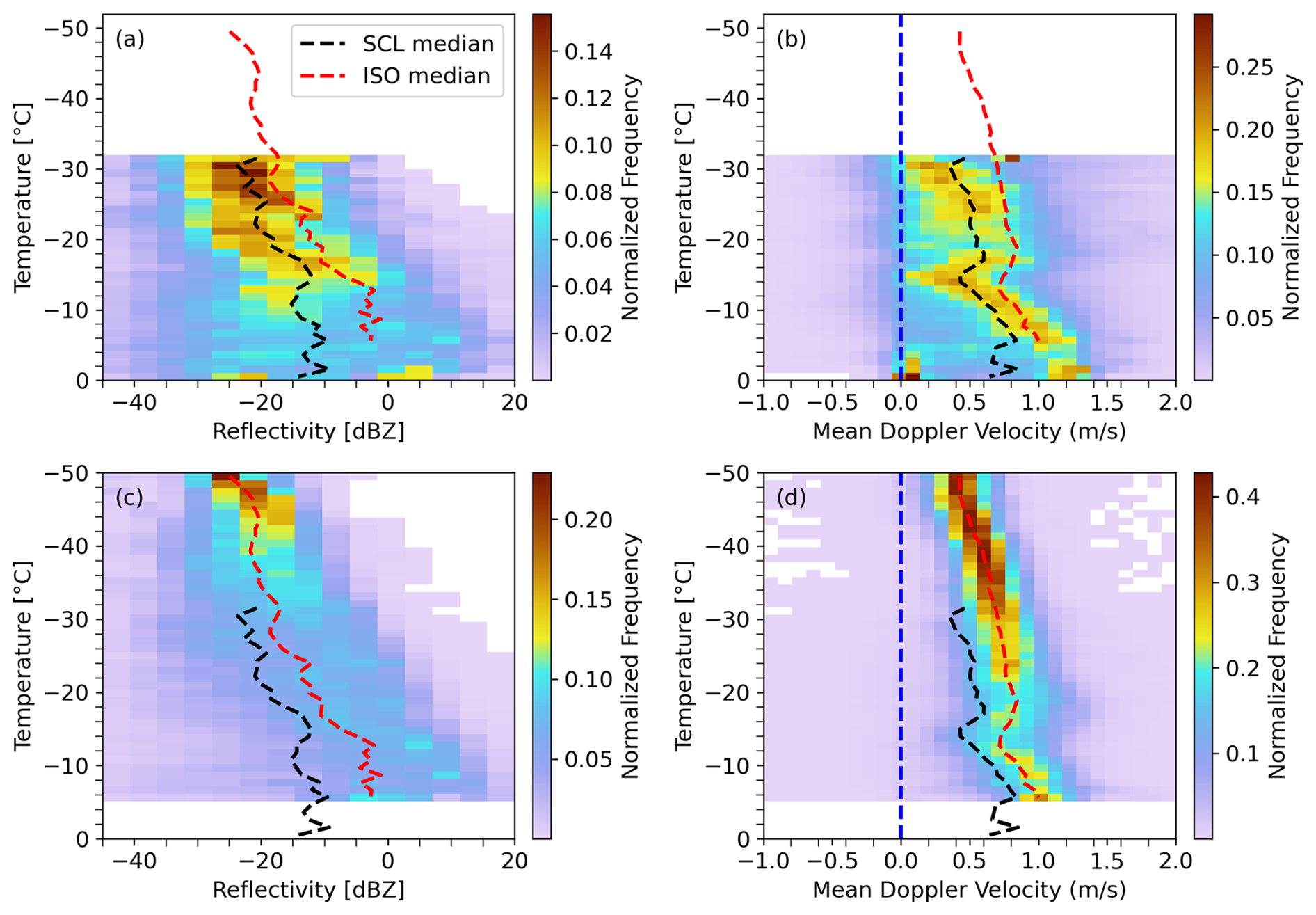 Figure 3Normalized frequency distribution of reflectivity (dBZ, panels ab) and mean Doppler velocity (MDV, m s−1, panels cd) as a function of temperature (°C) under different moisture conditions. Panels (a) and (b) correspond to SCL conditions, while panels (c) and (d) correspond to ISO conditions. The dashed black and red lines represent the median profiles for SCL conditions and ISO condition, respectively. The blue dashed line indicates the reference line for MDV = 0 m s−1. The color shading indicates the normalized frequency of observations within each temperature-MDV or temperature-reflectivity bin.