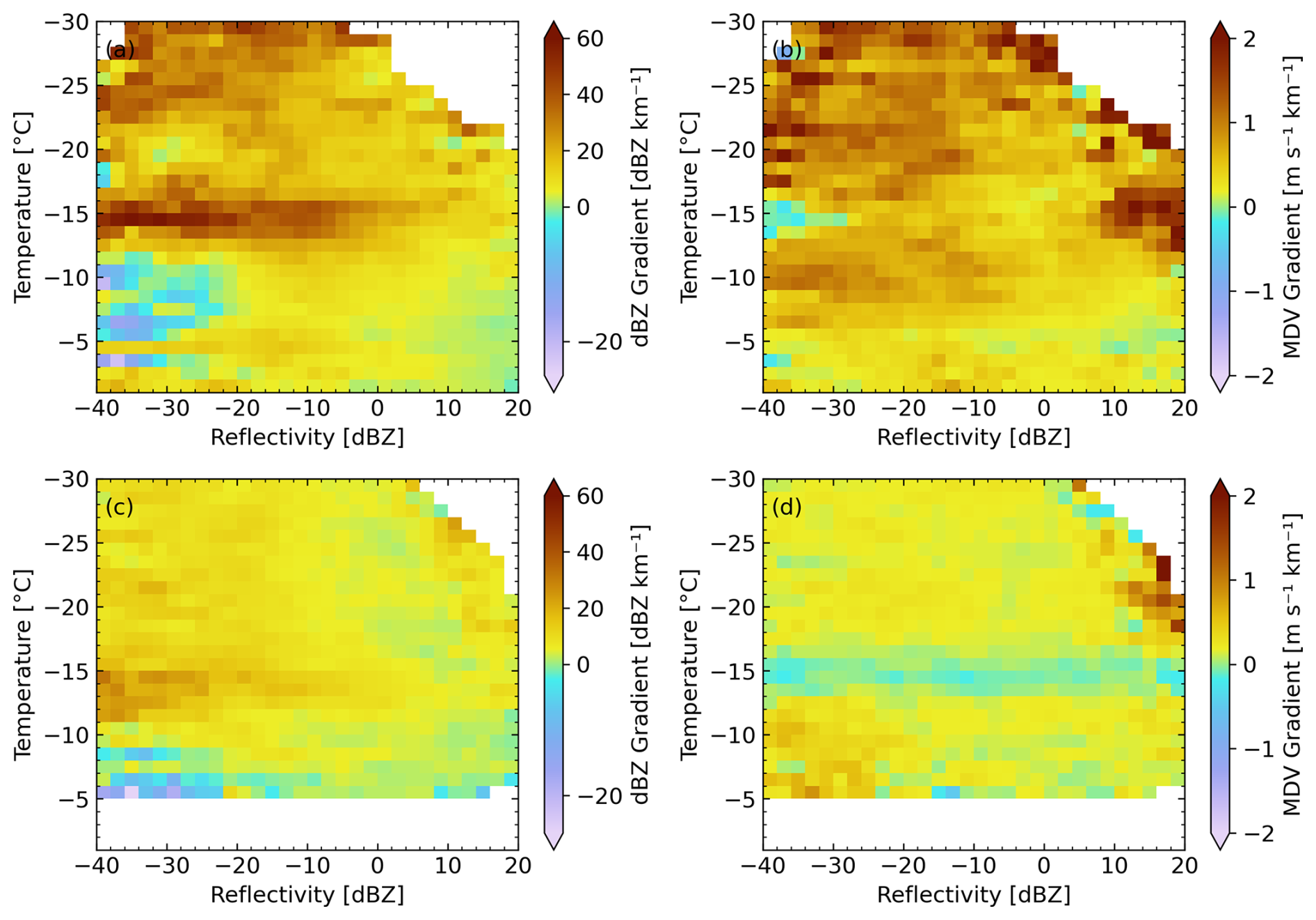 To further explore the particle size dependence in the observed patterns in the dendritic growth regions, Fig. 4 examines the dBZ gradient and MDV gradient as a function of dBZ and temperature for SCL conditions and ISO conditions. In SCL conditions, Fig. 4a clearly shows the significant increase in dBZ gradient at around 15 °C at reflectivity from 40 to 10 dBZ. The relative small and even negative MDV gradient is significant at smaller reflectivity <28 dBZ. For ISO conditions, the small MDV gradients coexist with large positive dBZ gradients (>30 dBZ km−1, Fig. 4c) when reflectivity <5 dBZ. The small MDV gradient (<0.2 m s−1 km−1) at around 15 °C extends to reflectivity of 20 dBZ, while the large dBZ gradients (>20 dBZ km−1) are limited to small reflectivity <-5 dBZ. The larger gradients of reflectivity and MDV observed for SCL conditions compared to ISO conditions may result from heavy riming. For both SCL and ISO conditions, small or negative MDV gradients coexist with large dBZ gradients at relatively low reflectivity around 15 °C, suggesting that there are additional slow-falling ice particles at one height than the height above. This is because at low reflectivity (inferring small preexisting particles), an increase in the number of slow-falling particles contributes substantially to reflectivity and also reduces the MDV, leading to increased dBZ and decreased MDV gradients. In contrast, when preexisting particles are already large (high reflectivity), size effects from preexisting particles dominate over number concentration, so additional small particles produce only a limited increase in reflectivity and exert little influence on MDV (reflectivity-weighted mean), resulting in smaller gradient change than for the low-reflectivity situations.