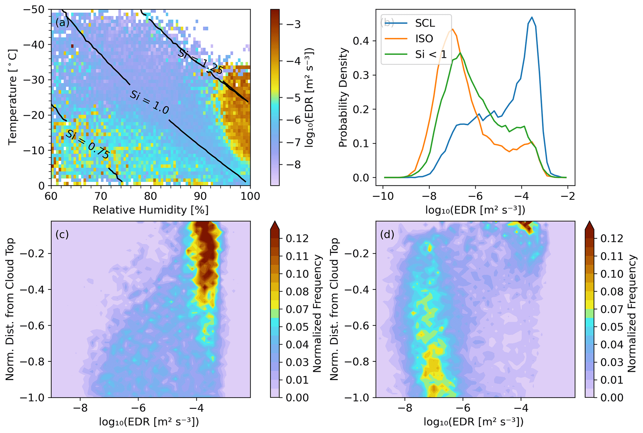 Figure 5(a) Median values of EDR as a function of relative humidity (%) and temperature (°C), the black contour lines indicate different saturation levels with respect to ice (Si = 1.25, 1.0, and 0.75); (b) PDF of EDR under SCL conditions (blue line), ISO conditions (orange line), and Si < 1.0 conditions (green line). Vertical distribution of in-cloud EDR under (c) SCL conditions and (d) ISO conditions.