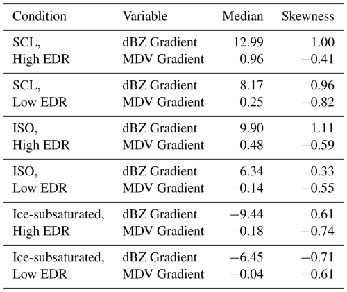 Table 1Median and skewness of dBZ and MDV gradients under six thermodynamic-turbulence conditions. Units: dBZ gradient in dBZ km−1, MDV gradient in m s−1 km−1.