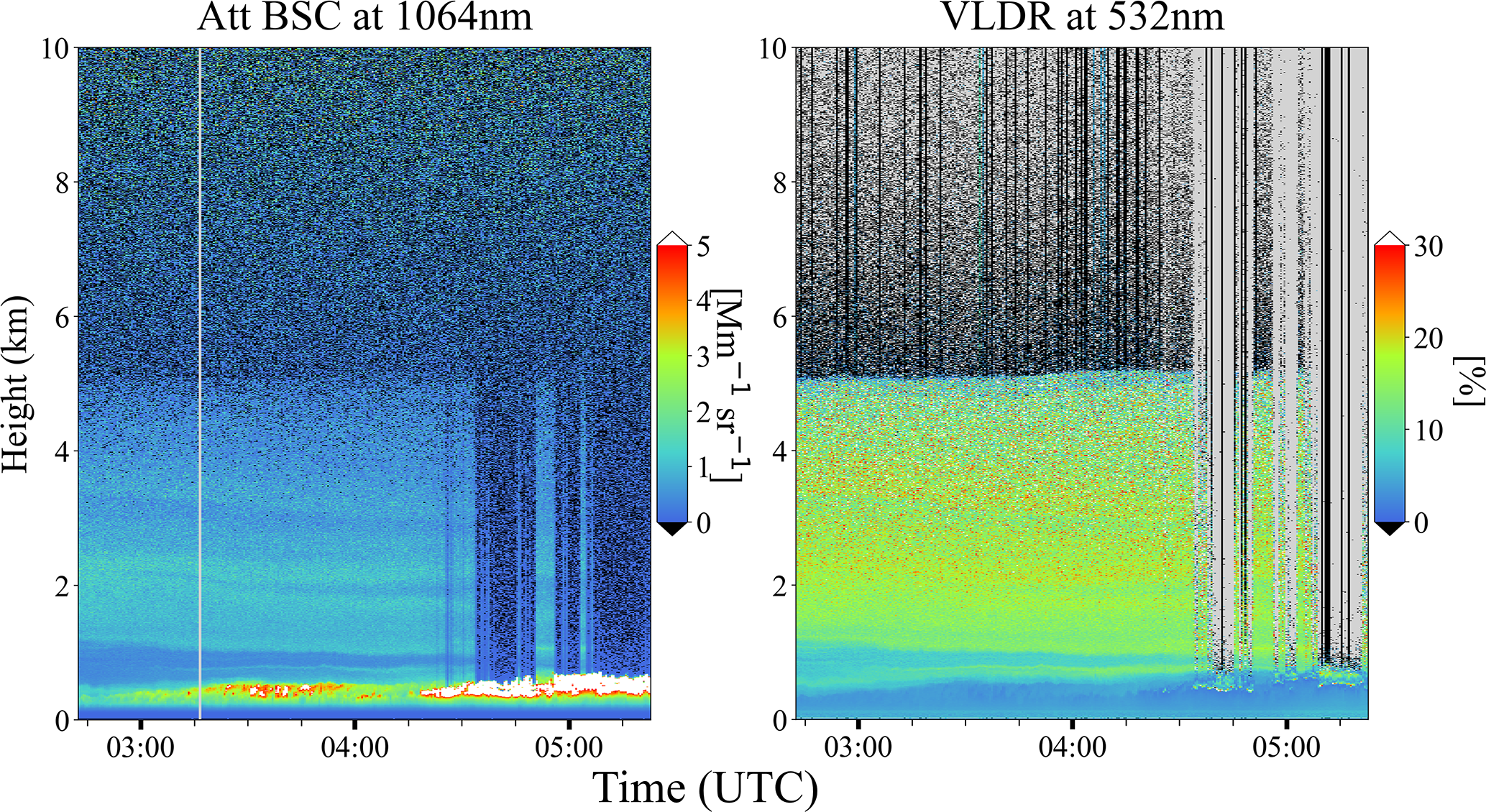 Figure 1Ground-based PollyXT Lidar at Mindelo (16.87° N, 24.99° W), Cabo Verde, on 10 September 2021, depicting the attenuated backscatter coefficient (Att Bsc) at 1064 nm (left panel), and volume linear depolarization ratio (VLDR) at 532 nm (right panel).