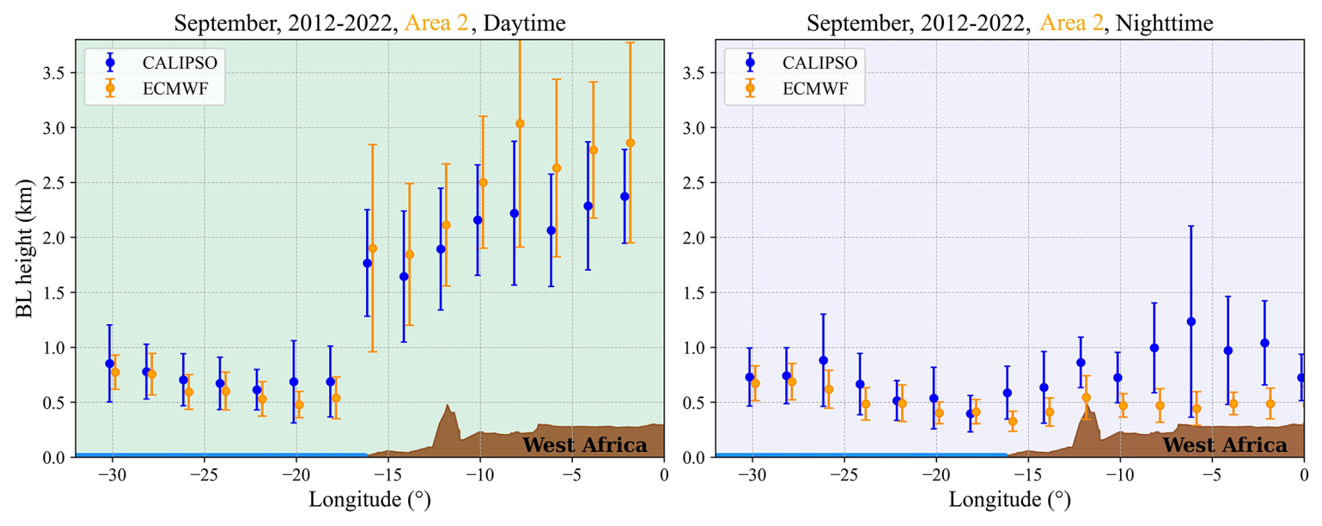Figure 6BL height along the latitude of 16.84° N for September 2012–2022 (Area 2), derived from CALIPSO lidar (blue points) and ECMWF model data (orange points). CALIPSO trajectories were collocated with the nearest ECMWF model grid, and data were averaged over 2° longitudinal intervals. The error bars represent the variability in the BL height. The brown shaded region represents the topography of West Africa, indicating landmass and orographic features influence on the BL structure (sourced from Google Earth). The left figure illustrates results from daytime and the right illustrates nighttime CALIPSO trajectories.