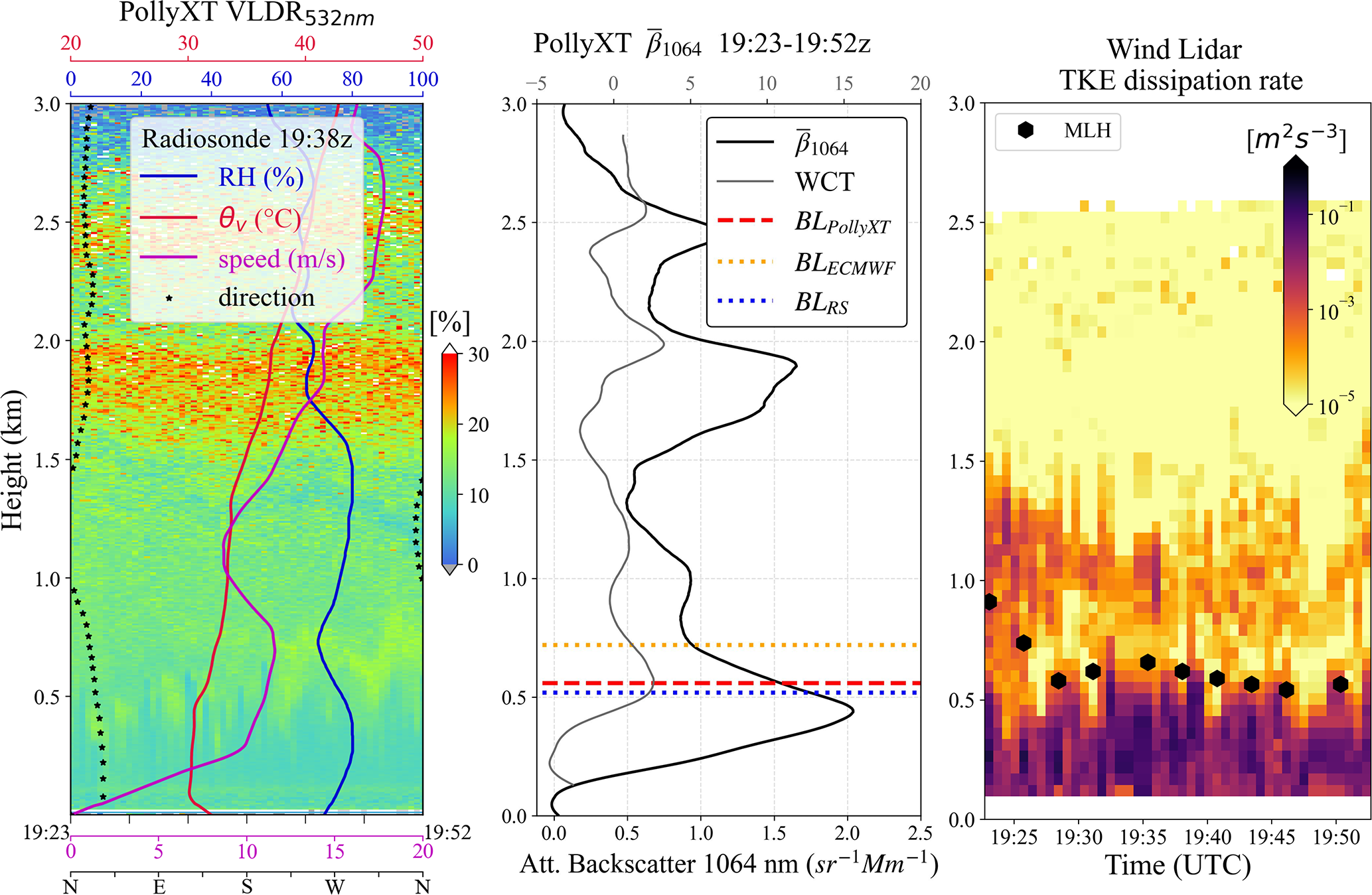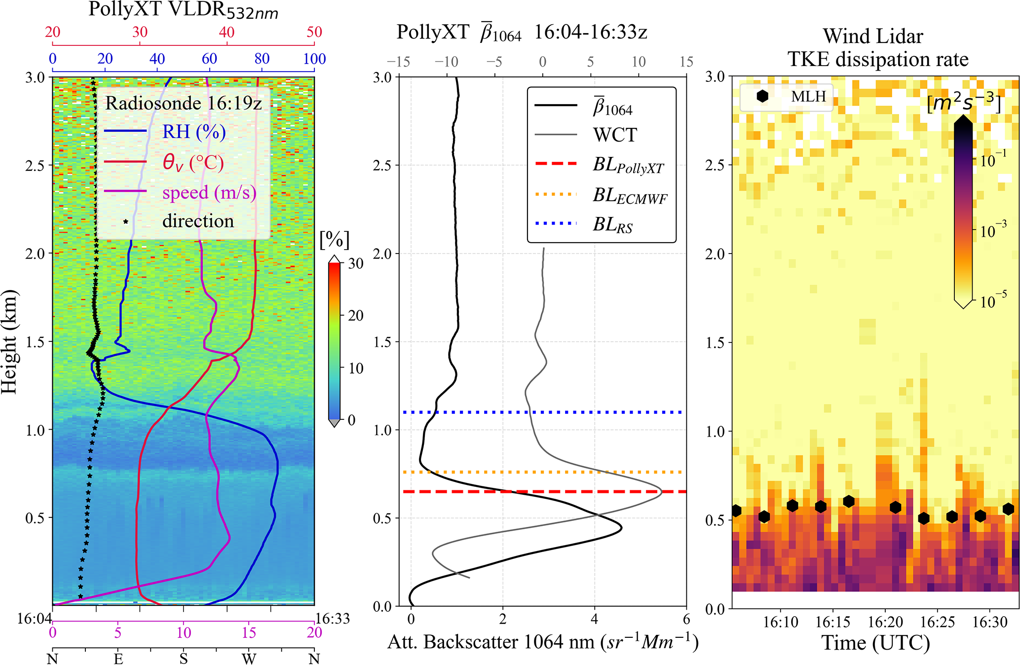 Figure 9b presents the attenuated backscatter coefficient () profile at 1064 nm from the PollyXT lidar (black line). The profile is averaged over a 30 min period around the radiosonde launch time (16:24–16:34 UTC). The grey line represents the WCT method, with its maximum indicating a layer top at 650 m (red dashed line). For comparison, the ECMWF BL top at the radiosonde launch time is shown as a dotted orange line at 760 m and the radiosonde BL top as a dotted blue line at 1.1k̇m. The TKE dissipation rate from the Halo Wind Lidar (Fig. 9c) shows larger values below approximately 520 m, aligning with the identified MLH (black hexagons).