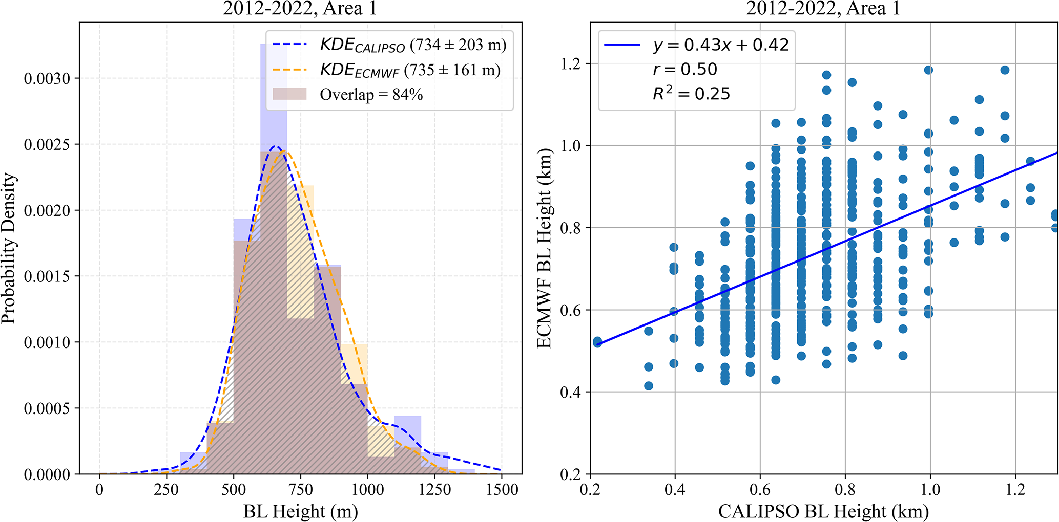 Figure A1Distribution and intercomparison of BL heights from CALIPSO and ECMWF for Area 1 (2012–2022). Left panel: normalized histograms and kernel density estimates (KDE) for both datasets. The shaded hatched region highlights the overlap of the two histograms (84 %), indicating a strong similarity in the overall distributions. Right panel: scatter plot of collocated BL heights, with linear regression (blue line) and statistics of the fit.