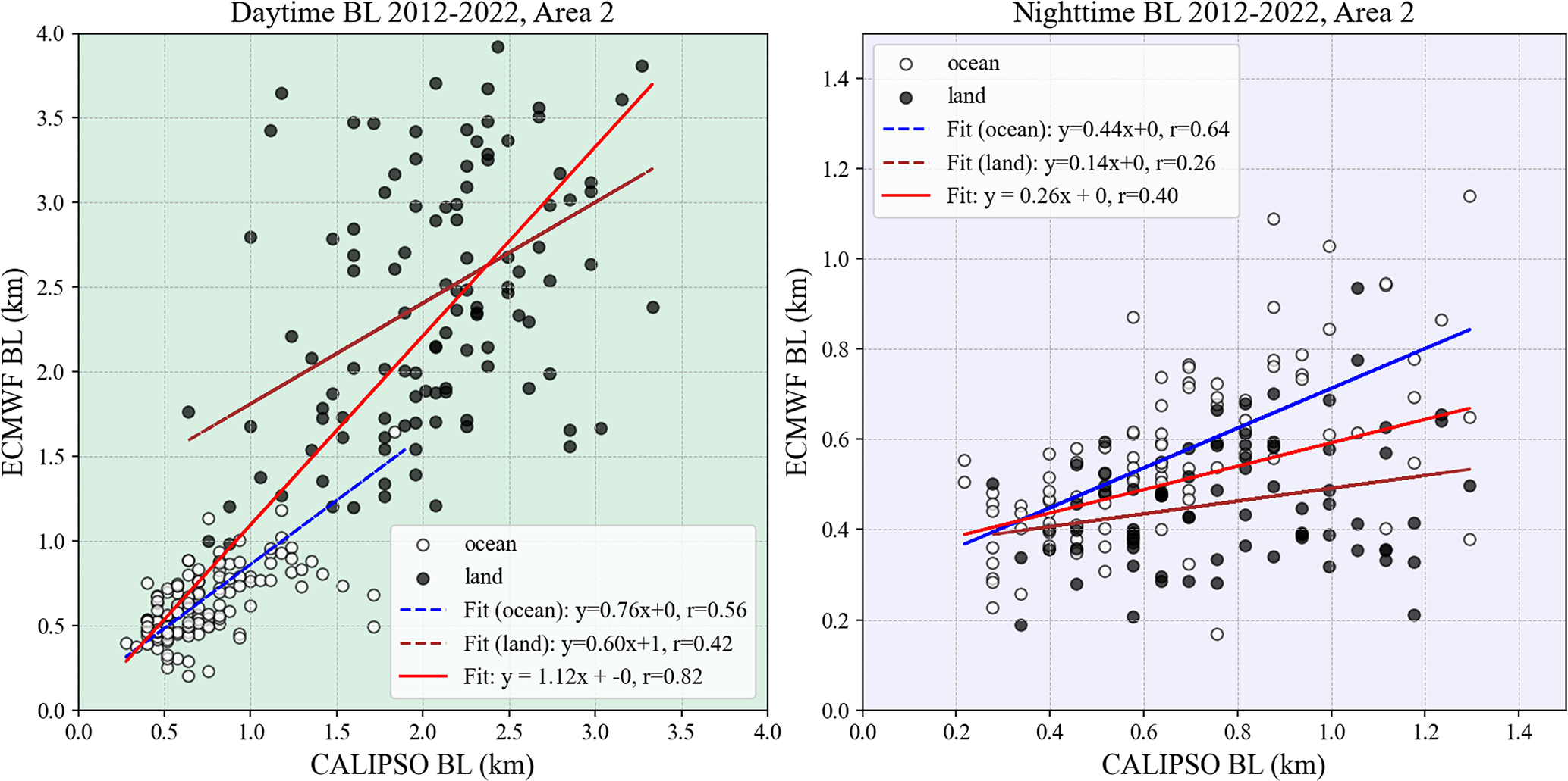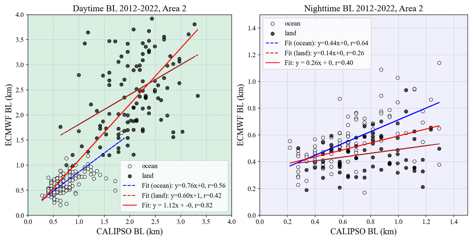 As indicated in Fig. A3, the overall correlation between CALIPSO and ECMWF boundary layer heights is high during daytime (r=0.82, solid red line). However, when separating ocean and land points, the correlations are notably lower (r=0.56 for ocean, r=0.42 for land; blue and maroon dashed lines respectively). At nighttime (Fig. A3, right), the correlation improves slightly for ocean points (r=0.64) but remains moderate, while the overall correlation between CALIPSO and ECMWF points is poor.