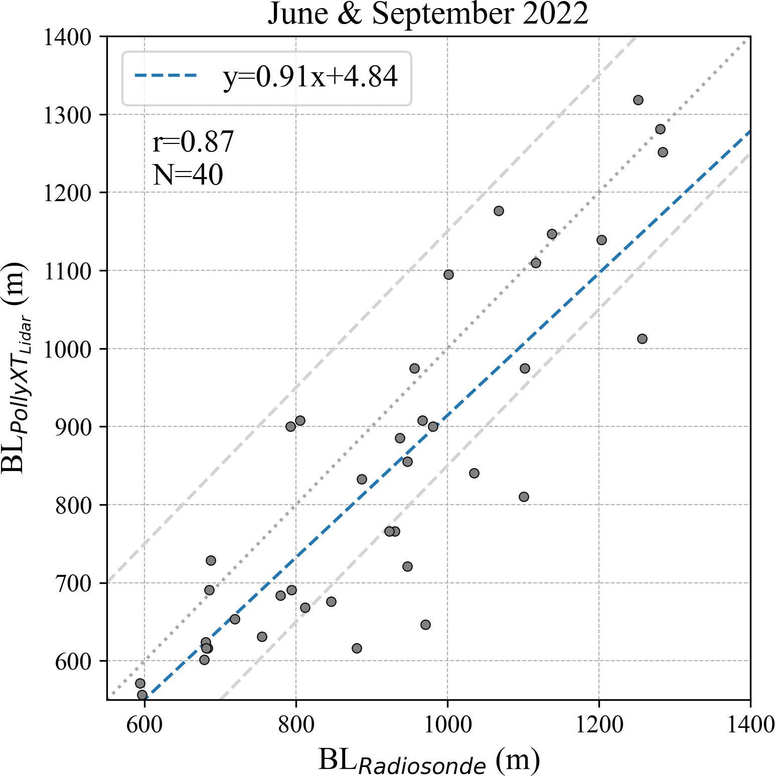 Figure A4Correlation between boundary layer heights retrieved from radiosondes and the PollyXT Lidar for June and September 2022 (N=40). The grey dotted line represents the 1:1 line (y=x), while the grey dashed lines indicate ±150 m from the 1:1 line. The blue dashed line shows the linear regression fit () and correlation coefficient r=0.87 highlighting the strong correlation between the two datasets.