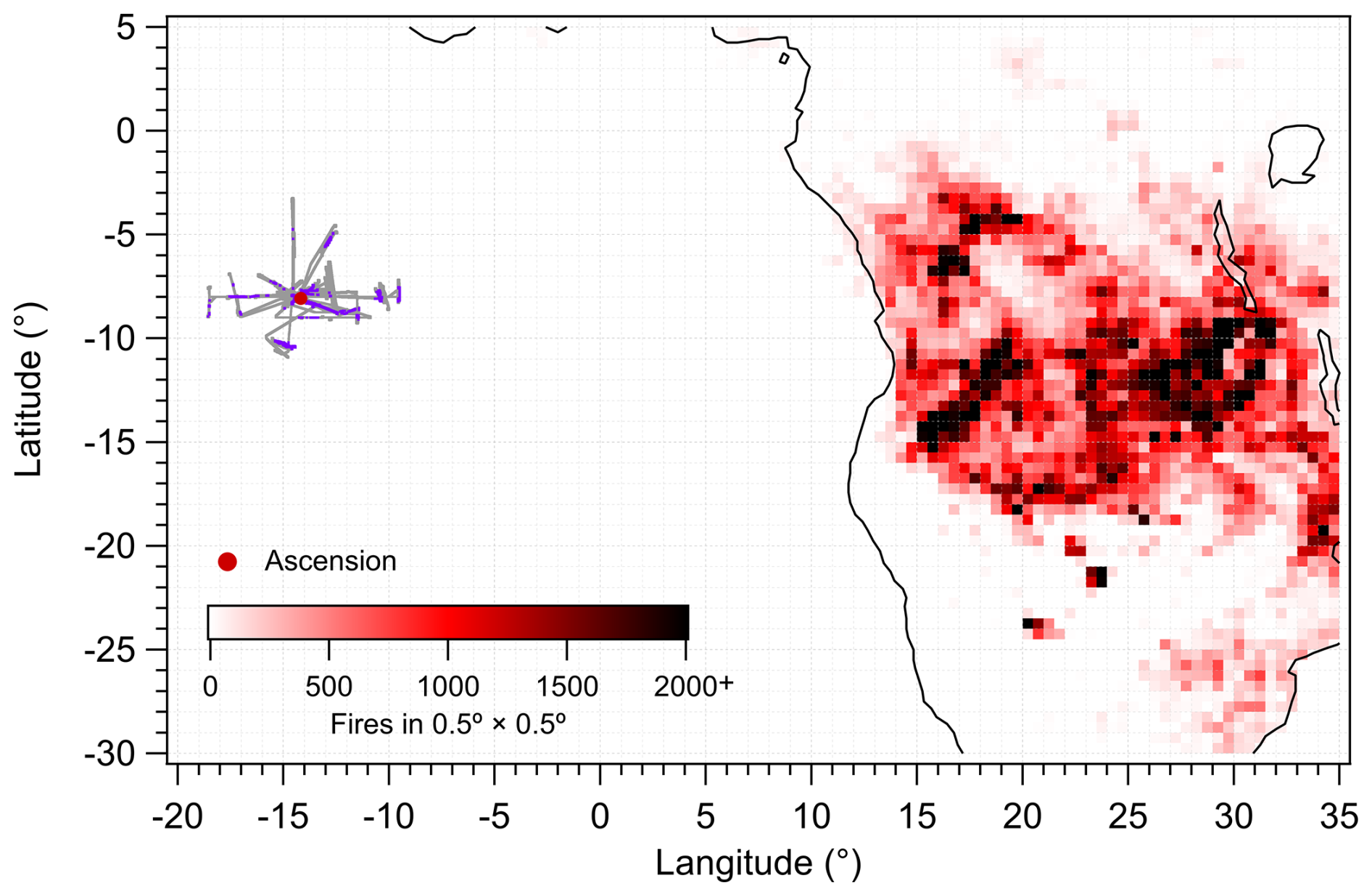 NAME backward-dispersion fields can represent the horizontal footprint of air parcels transported over the past 7 d before arriving at the sampling area over Ascension Island. For the flights employed in this study, example backward-dispersion fields corresponding to release times within the flight sampling period are presented, distinguishing between FT (Fig. S3) and MBL (Fig. S4) simulations. FT dispersion simulations (Fig. S3) indicate that most FT air parcels over Ascension Island originated from westerly flow across the SEA and African continent. Compared to clean FT cases from Period 1, polluted FT cases from Periods 2 and 3 show a substantially greater influence from African continental airmasses. MBL dispersion simulations (Fig. S4) suggest that MBL air parcels over Ascension Island mainly arose from clean oceanic flow that transported from the southeast to northwest over the SEA. Polluted MBL cases from Periods 1 and 3 also show contributions of westerly flow originated from the African continent, while negligible continental influence in clean MBL cases from Period 2. To assess the contributions of polluted airmass originating from the African continent to the Ascension Island area, we calculated the fractional contributions of original airmass over the African domain (20° S–5° N, 9–35° E) based on the outputs of 3-hourly NAME backward-dispersion fields. This continental domain is closely associated with BB pollutions identified in satellite wildfire observations (Fig. 1). The resulting analysis provides a quantitative indication of BB plume influence on the Ascension Island area throughout the campaign period, as shown in Fig. 2b (FT simulations) and Fig. 2c (MBL simulations). The temporal evolution of continental contributions aligns well with the observed FT and MBL pollution patterns over Ascension Island. NAME simulations evidence that the FT and MBL pollutions observed during the campaign were attributable to long-range transport of African continental airmass which brought BB plumes.