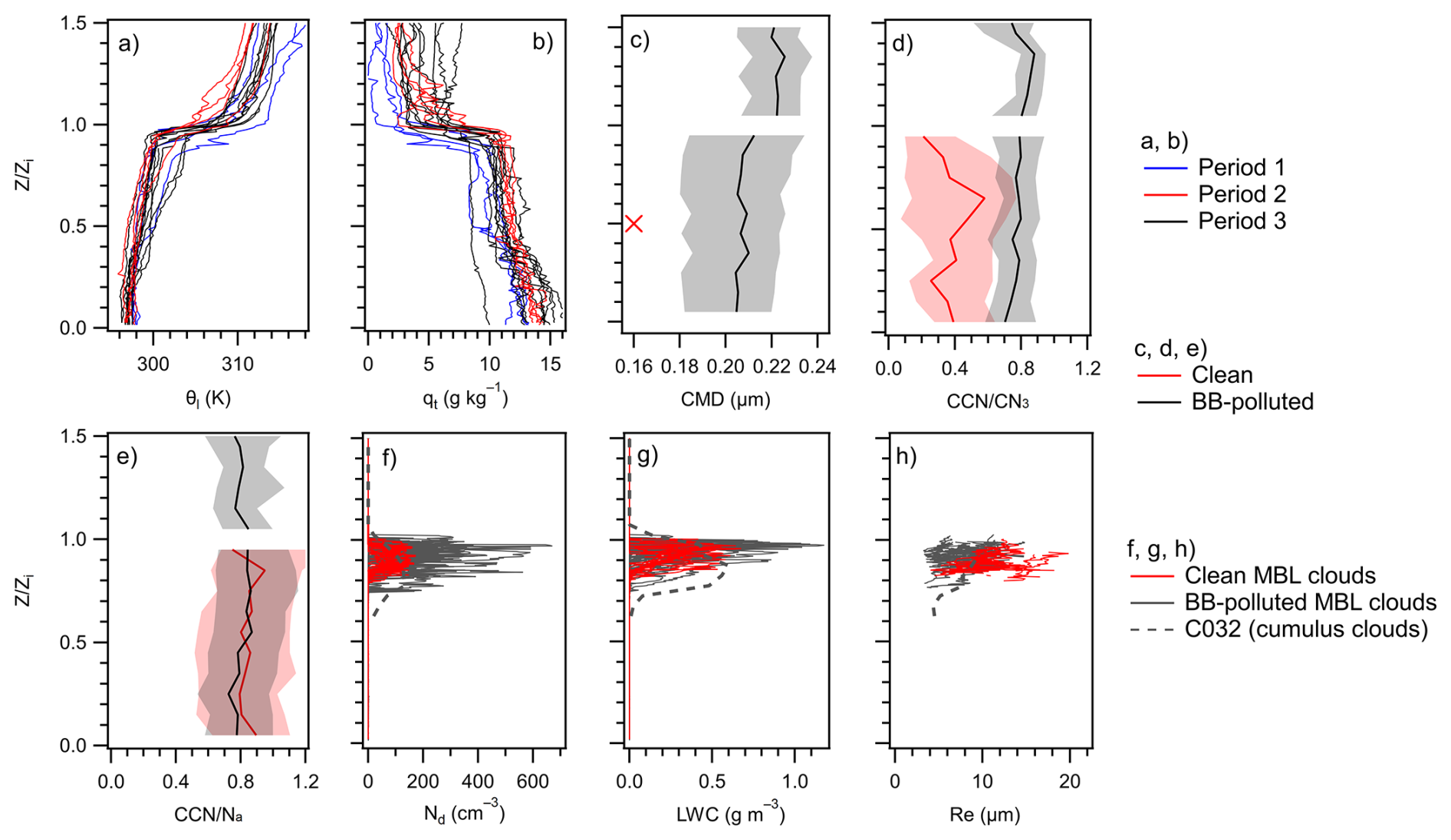 Figure 3(a, b) Average vertical profiles of (a) liquid water potential temperature (θl, K) and (b) total water mixing ratio (qt) for each flight used in this study. Blue, red and black lines represent measurements from Periods 1, 2 and 3, respectively. (c–e) Summarized profiles of (c) aerosol count median diameter (CMD, µm) derived from the PCASP and (d, e) the ratios of CCN number concentration (at SS = 0.2 %) to CN3 from the CPC (CCN / CN3) and Na from the PCASP (CCN /Na) under BB-polluted (black) and clean (red) conditions. Solid lines and shades represent median values and ranges from 10 to 90 percentiles. The red cross marker in panel (c) represents the average CMD in accumulation mode from aerosol measurements within the clean MBL. (f–h) Vertical profiles of 1 Hz, (f) cloud droplet number concentration (Nd, cm−3), (g) liquid water content (LWC, g m−3), and (h) cloud effective radius (Re, µm) in sampled continuous cloud profiles. Red lines represent cloud profiles in the clean MBL, and grey lines represent cloud profiles in the BB-polluted MBL. It is noted that average vertical profiles of cloud properties from flight C032 are also provided in panels (f)(h) (grey dashed lines). The y-axis uses a height scale normalized by inversion height (zi).