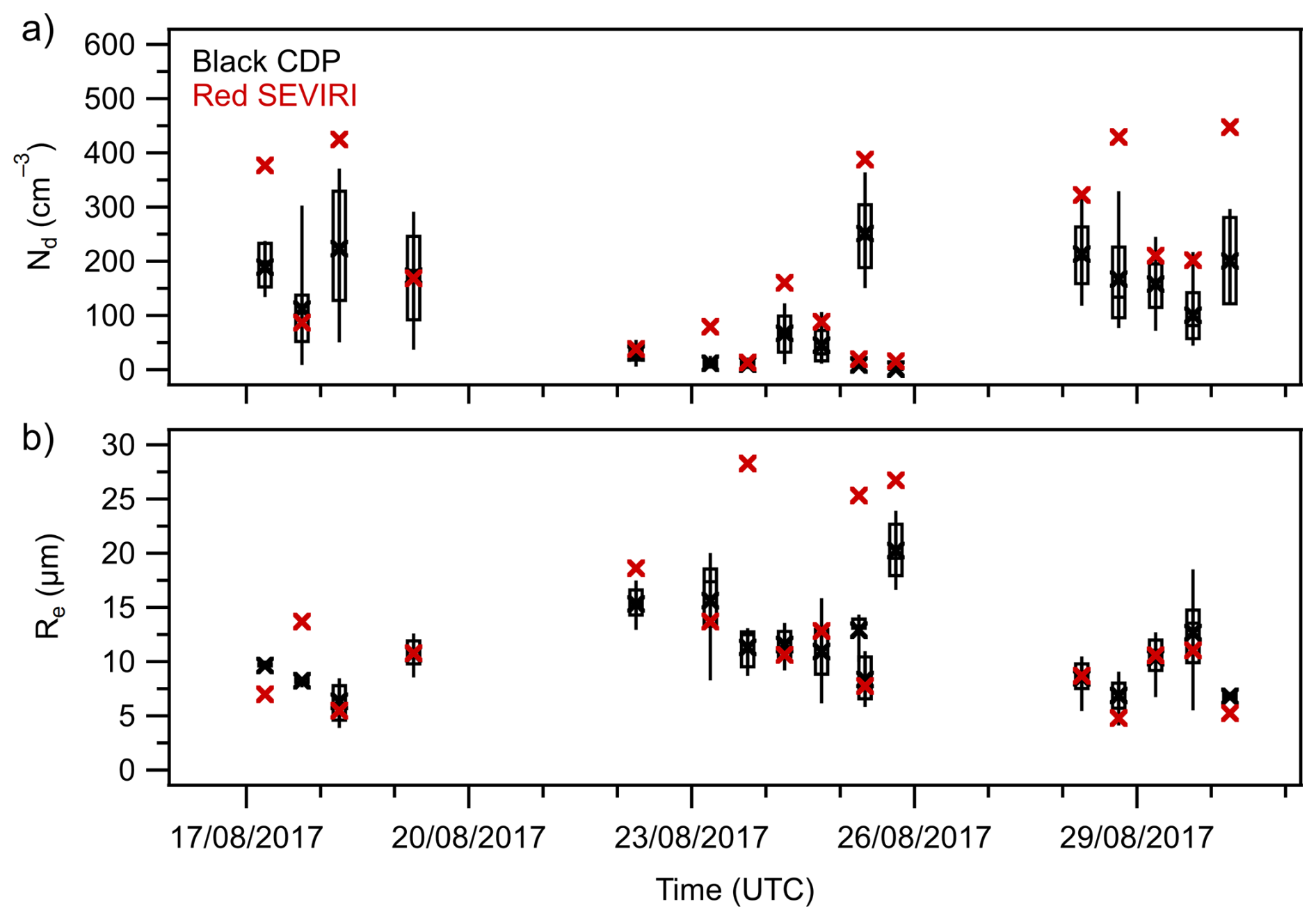 It is noted that only data from liquid clouds in the MBL (cloud top height less than 3000 m) are included in this analysis. SEVIRI aerosol and cloud retrievals are available for the period of 16–31 August 2017. Observations were collected daily between 06:12 and 17:57 UTC, with a time resolution of 15 min.