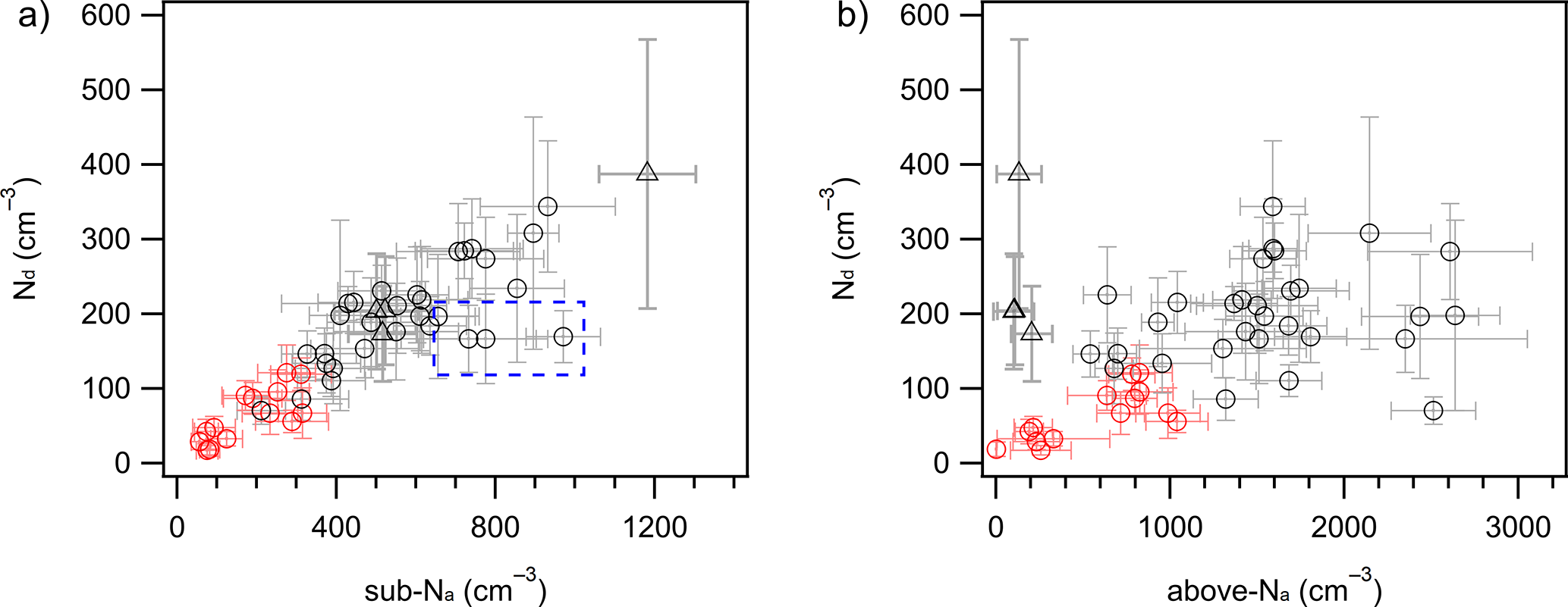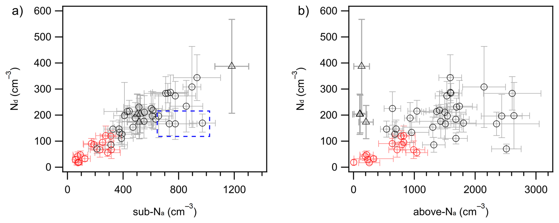 Figure 5Relationships between cloud-layer mean Nd and Na for all profiles, in terms of (a) sub-Na and (b) above-Na. The markers and error bars represent the average values and standard deviation for each profile. Black triangle and circle markers are from the BB-polluted MBL in Periods 1 and 3, respectively, and red circle markers are from the clean MBL in Period 2. The blue dashed box represents the contact profiles that outline the central relationship between Nd and sub-Na and had average LWC / aLWC values close to 1.