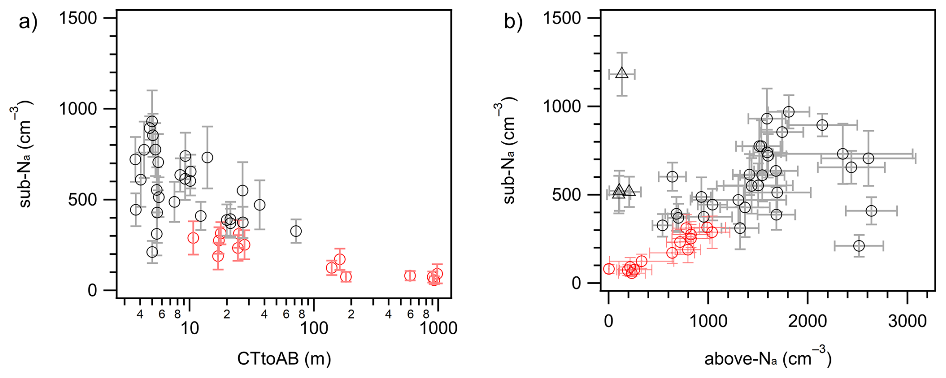 Figure 6Relationships (a) between sub-Na and the distance from the top of the MBL cloud layers to the bottom of the FT BB layers (Cloud Top to Aerosol Base, CTtoAB); (b) between sub-Na and above-Na. The markers and error bars represent the average values and standard deviation for each profile. Black triangle and circle markers are from the BB-polluted MBL in Periods 1 and 3, respectively, and red circle markers are from the clean MBL in Period 2.