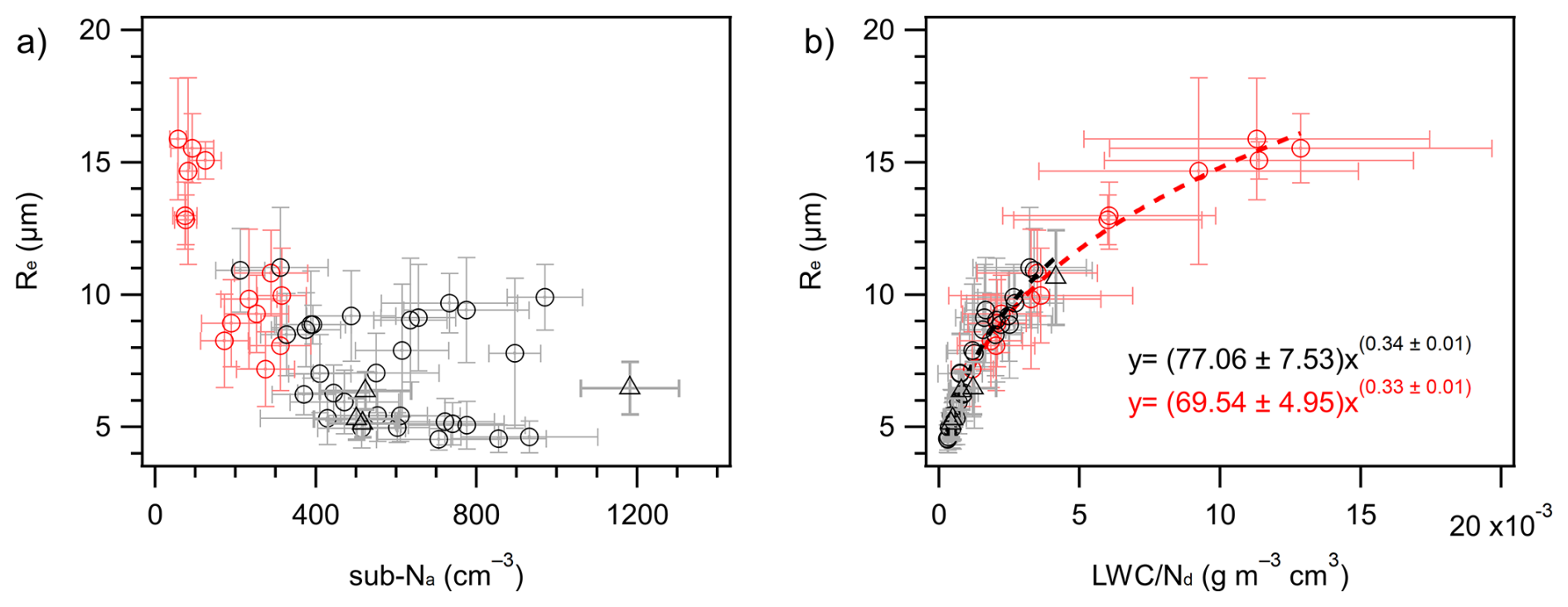 Figure 7(a) Relationship between cloud-layer mean Re and sub-Na for all analyzed profiles. (b) Relationship between cloud-layer mean Re and the average ratio of LWC /Nd for all analyzed profiles. The markers and error bars represent the average values and standard deviation for each profile. Black triangle and circle markers are from the BB-polluted MBL in Periods 1 and 3, respectively, and red circle markers are from the clean MBL in Period 2.
