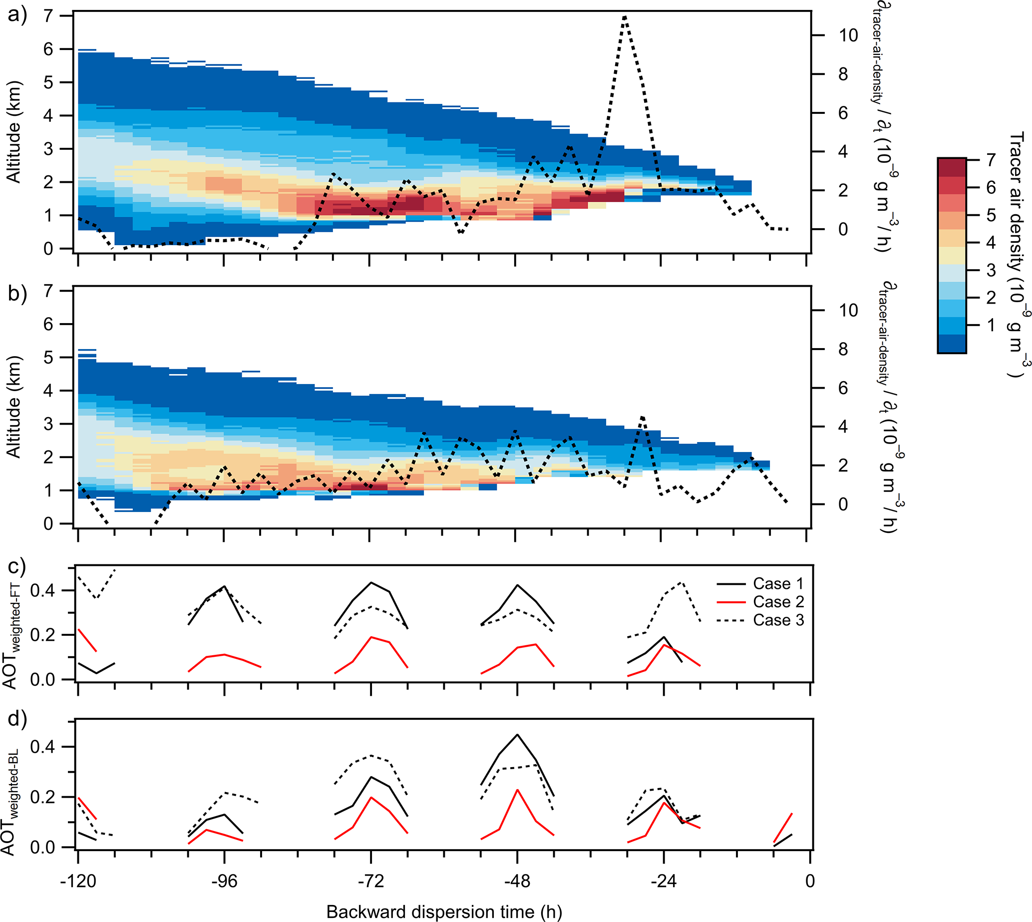 Figure 9(a–b) Time series of the vertical distributions of air parcels dispersed into the FT region (covering the horizontal area of 20° S–0° N, 15° W–12° E, see red box in Fig. 8), in terms of backward dispersion time from 3 to 120 h. The right axis (dashed black lines) are the corresponding 3-hourly exchange rates of air parcels dispersed between the FT and MBL, calculated by dividing the increase in dispersed FT air parcels by the dispersion time along backward simulations. Panel (a) is for Case 1 and panel (b) is for Case 3. (c–d) The air-density-weighted AOT co-located with (c) FT and (d) BL footptints along the backward-simulation time, for three cases.