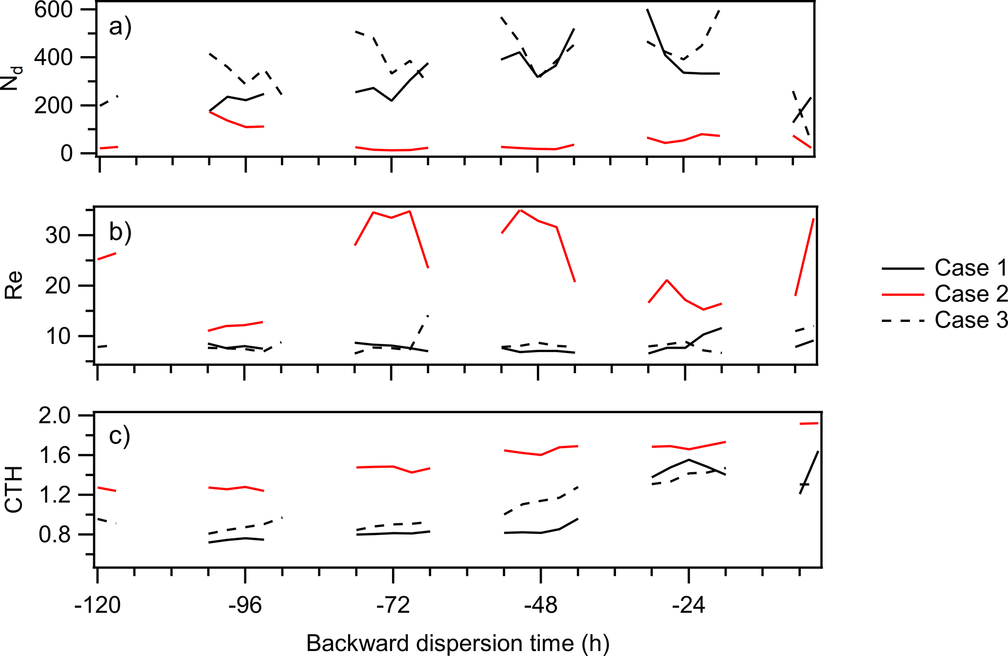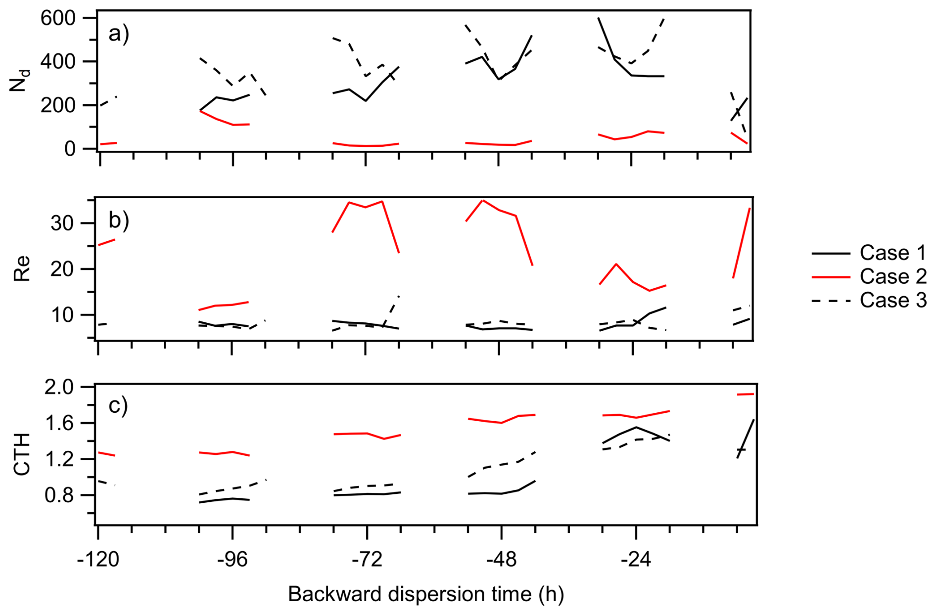 Figure 10The air-density-weighted (a) Nd, (b) Re, (c) CTH from SEVIRI, which are co-located with BL air parcels along the backward-simulation time, for three cases.