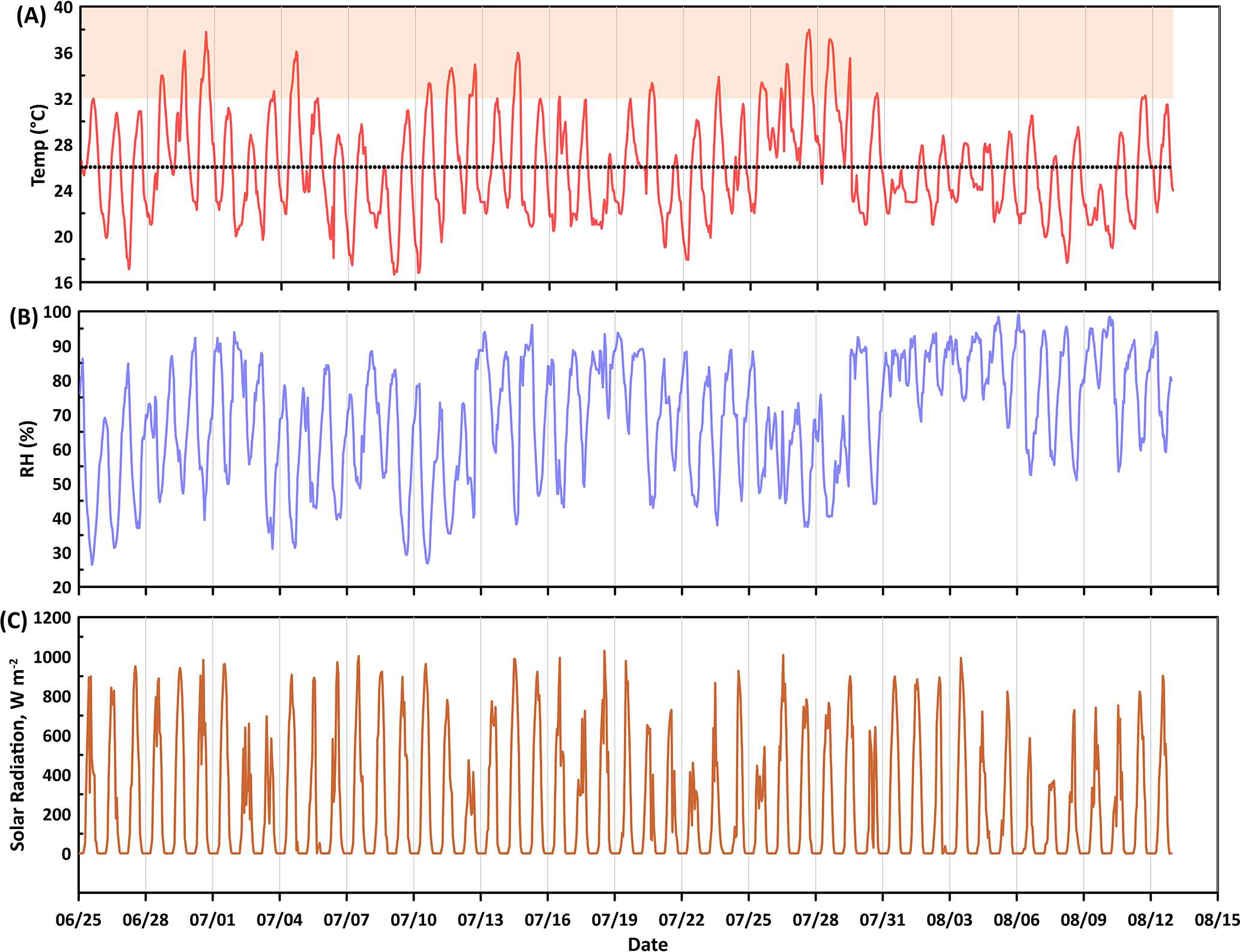 Figure 2Time series profile of (A) temperature, (B) relative humidity, RH, and (C) downward solar radiation at the temperate mixed deciduous forest in Missouri. The dotted line in the temperature plot is the average value during the measurement duration, and the shaded filled area denotes the extreme temperature conditions (>32 °C).
