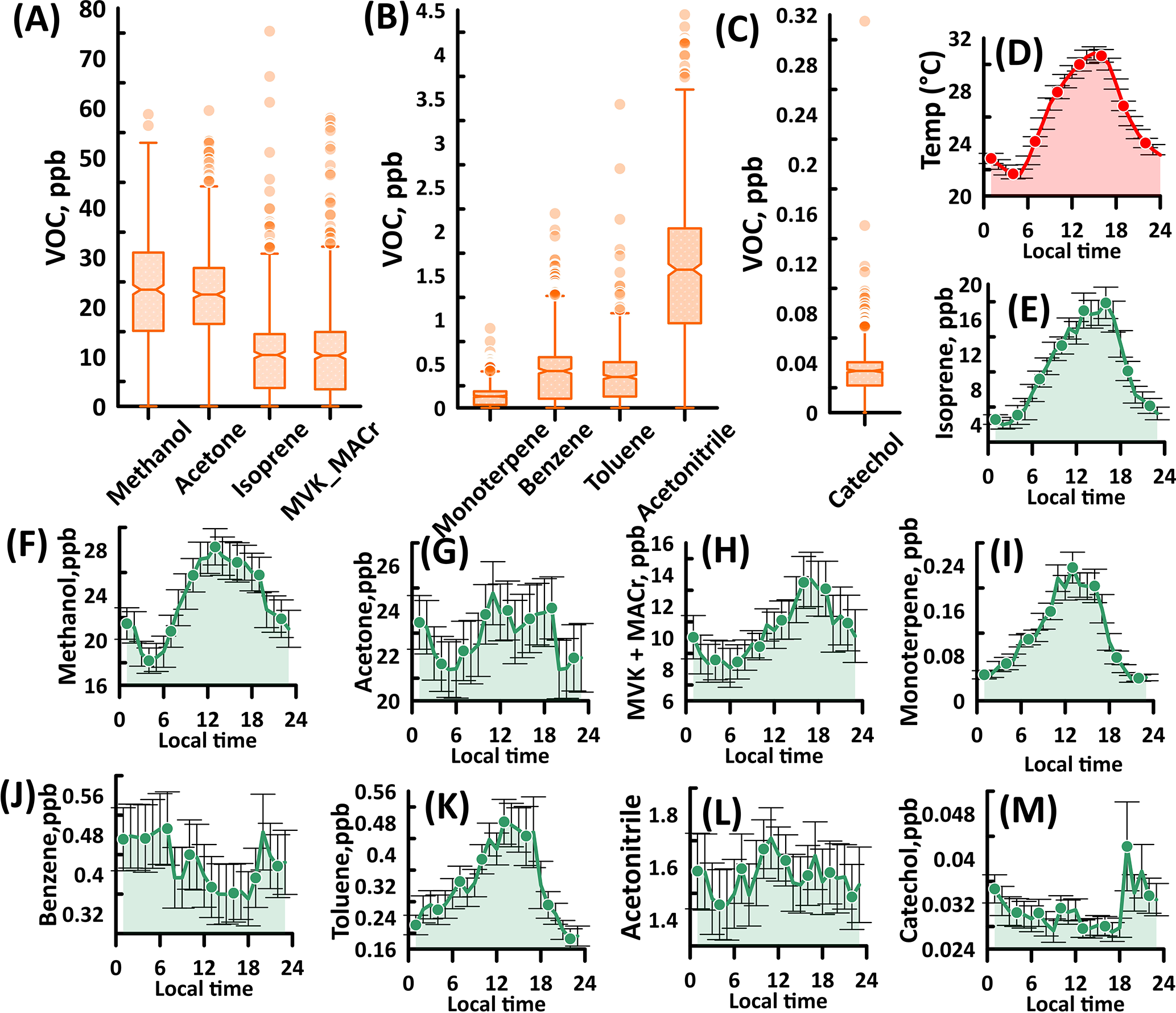 Figure 3(A–C) Average mixing ratio in ppb and (E–M) average diurnal profile of major VOCs at MOFLUX. Also included here is the average diurnal profile of (D) temperature for reference. Time reported here is the local daylight time. The center lines of the box and whisker plots are the mean mixing ratio. Box edges are quartiles, and lower (upper) corresponds to 25th (75th). Whiskers represent 1.5 times the interquartile range. Symbols outside the box plot are outliers. Diurnal profiles have a unit of ppb mixing ratio. MVK and MACr are methyl vinyl ketone and methacrolein. The error bars are represented by standard error.