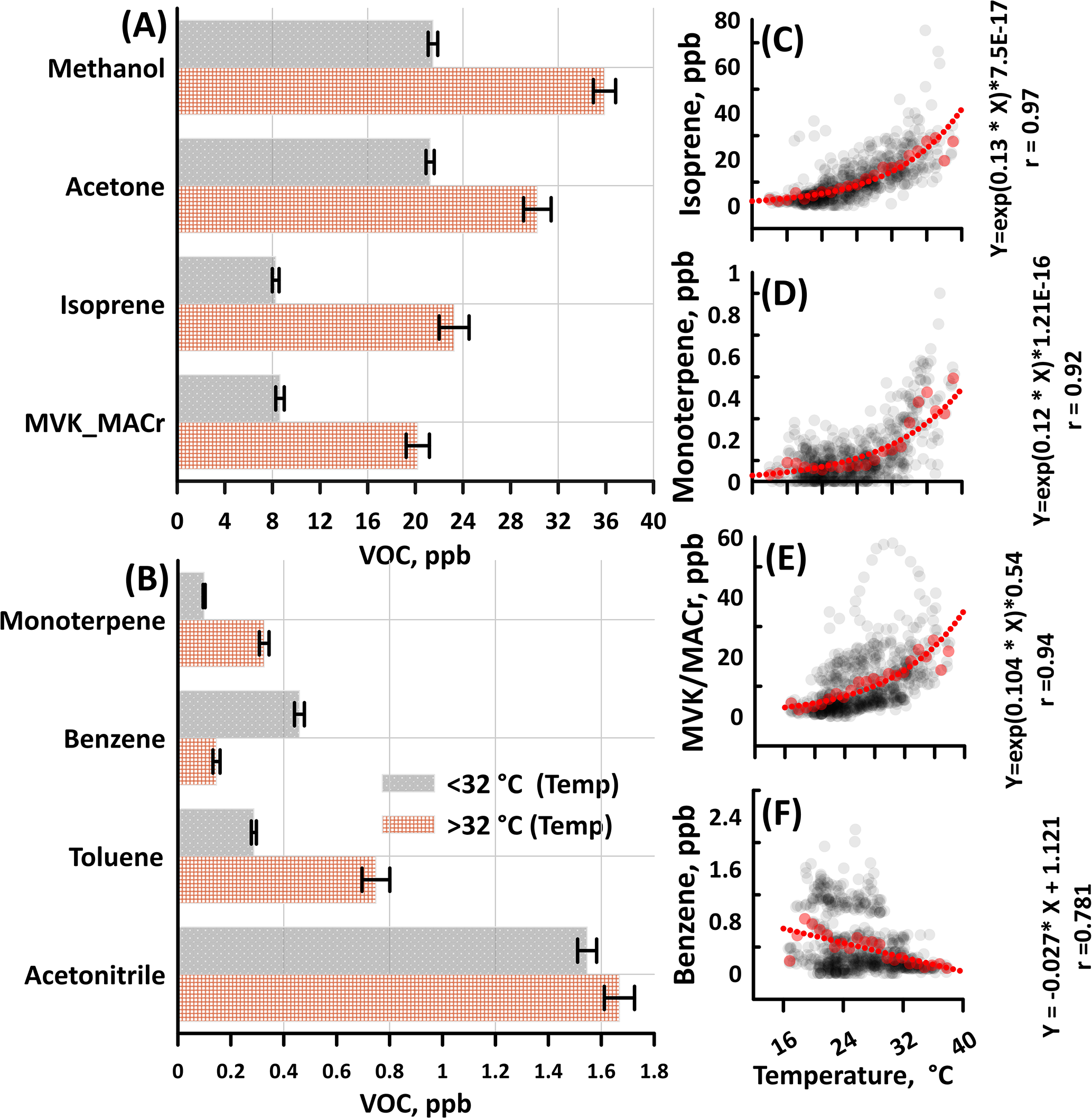 Figure 4(A–B) Comparison of VOC mixing ratios for temperatures below and above 32 °C. Catechol, not shown here, showed no evident difference between the two conditions (∼30 ppt). The error bars in the bar chart are represented by standard error. (C–F) The correlation analysis of temperature with biogenic VOCs and benzene mixing ratios (in ppb). Correlation analysis of other major VOCs is provided in the supplement (Fig. S3 in the Supplement). Black symbols are the hourly data, whereas the red lines indicate the best-fit line of the binned mixing ratio of VOCs according to 1.0 °C of temperature. The equation of the exponential fit line and correlation coefficients are given on the right side of the plot.