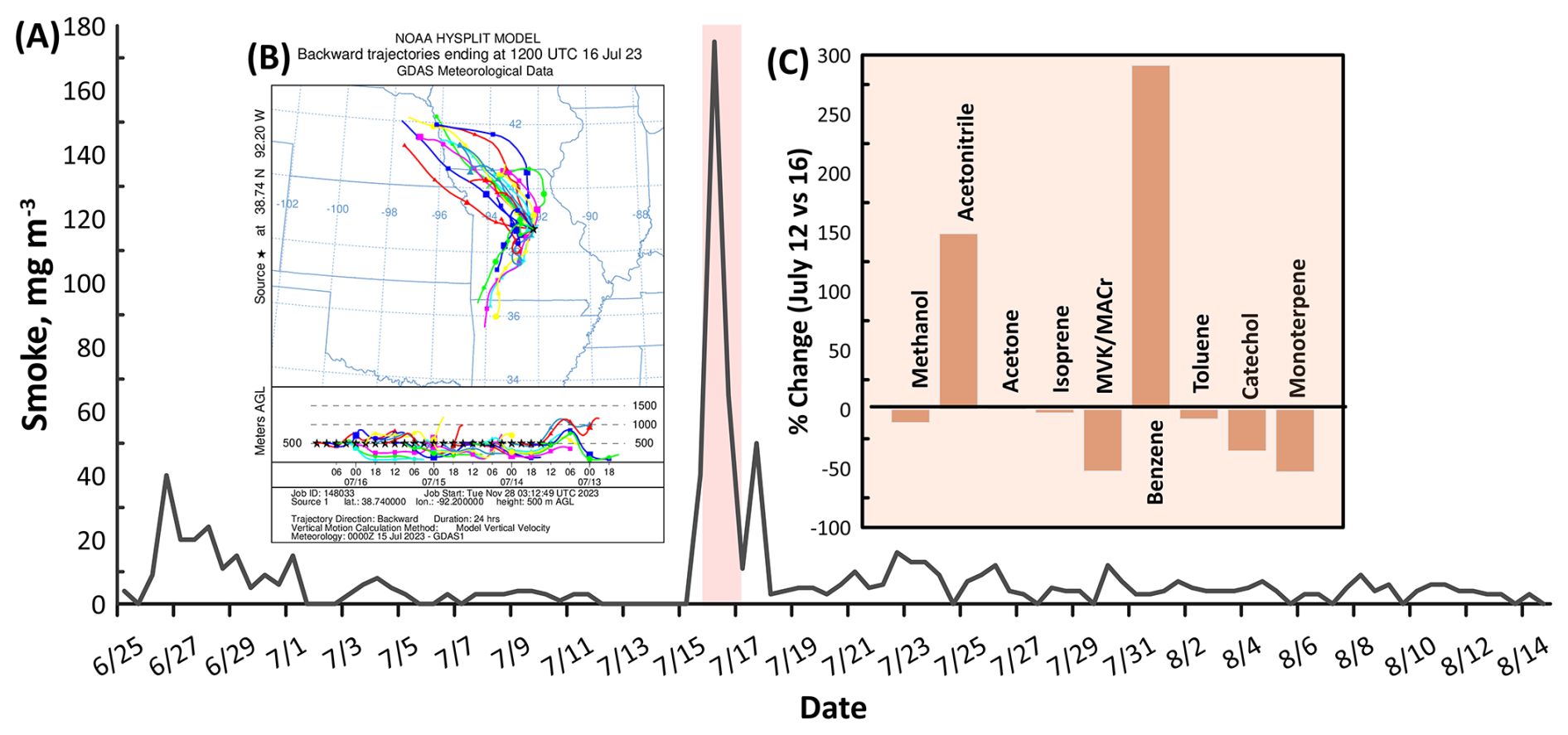 Figure 5(A) Smoke profile observed during the field measurement. The red highlighted area is the period with intense transport of BB plumes. (B) Backward air parcel trajectory analysis of plumes arriving on the 16 July (Stein et al., 2015). A larger image with higher resolution of the trajectory is presented in Fig. S5. (C) Percent change of the mixing ratios of major VOCs measured during days with no wildfire event (12 July) and with significant transport of BB markers (16 July).