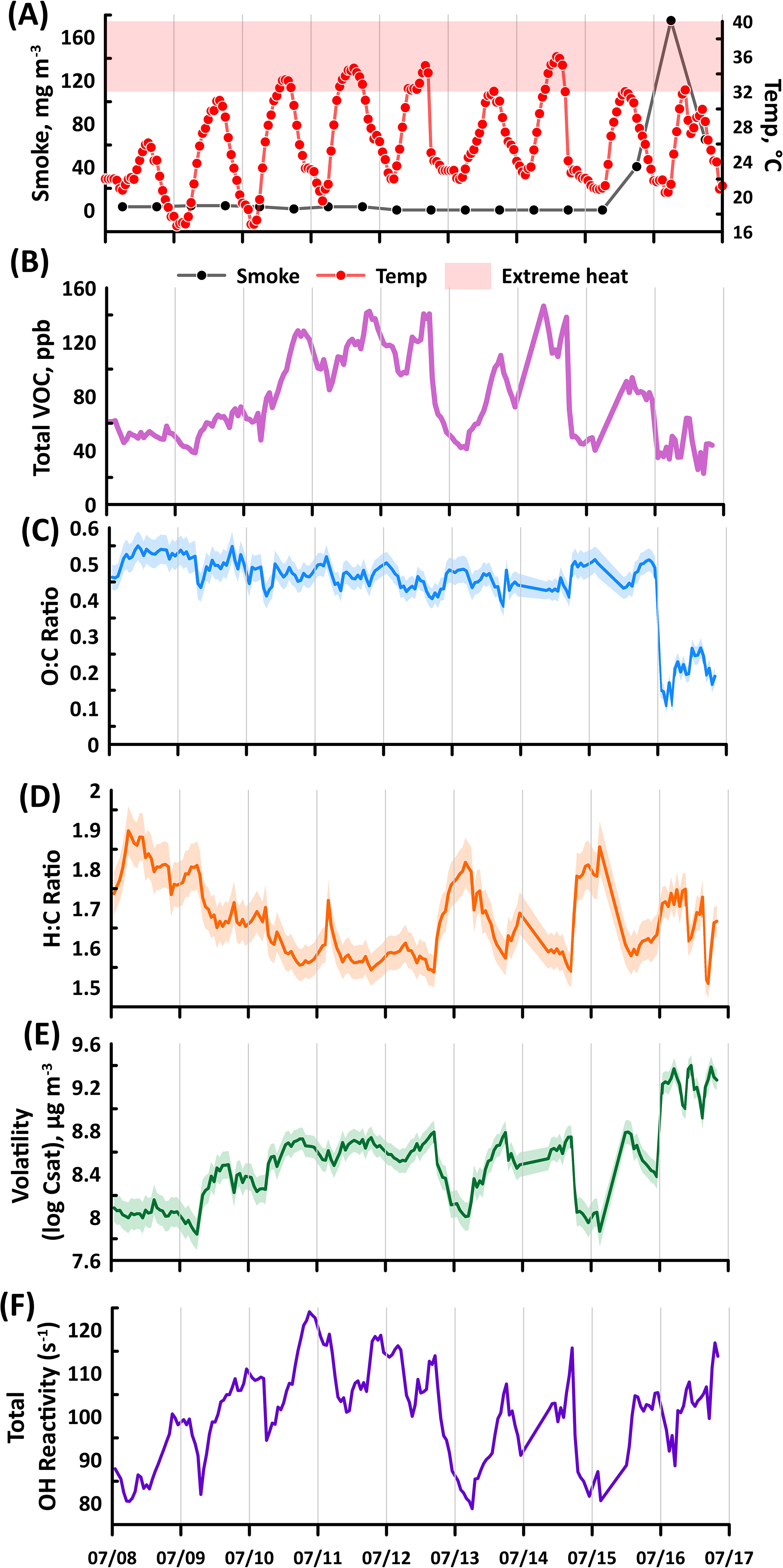 Figure 6(A) Time series profile of the smoke, and temperature observed at MOFLUX, (B) sum of VOC mixing ratio, (C) weighted O : C, (D) H : C ratios, (E) volatility, and (F) total reactivity during the intensive operational period between 8 to 17 July. The shaded regions of O : C, H : C, and volatility are the weighted standard deviations.