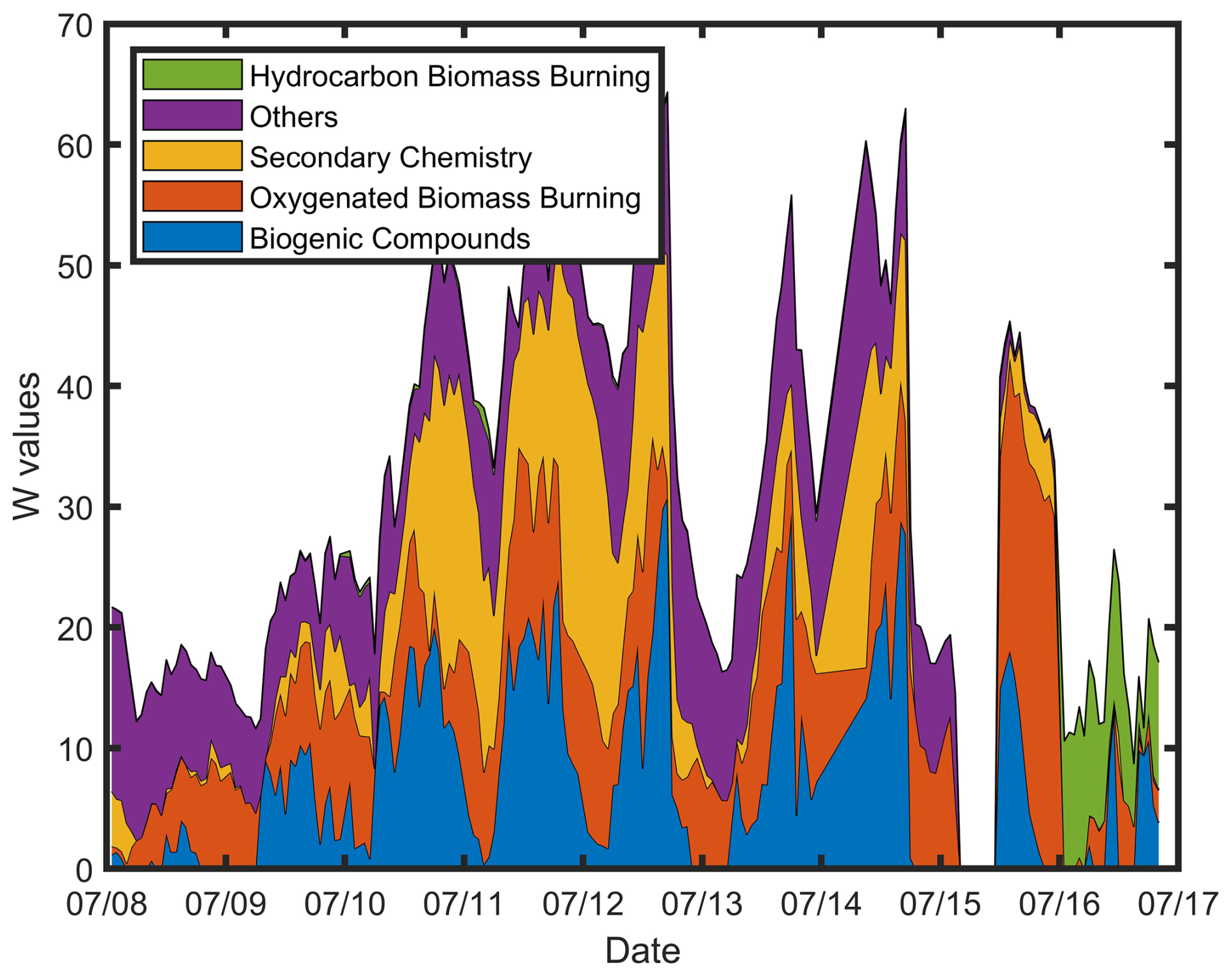 To systematically investigate the pattern and contributions of the extended list of VOCs, a NNMF routine was applied to study the prominent sources of the VOCs in the forest between 8 and 17 July. Based on the dominant tracers, response to the range of temperatures, impact of wildfire plume, and diurnal variations, five important categories were identified from the NNMF analysis: (i) Biogenic-related Compounds, (ii) Secondary Chemistry, (iii) Oxygenated BB compounds (O-BB), (iv) Hydrocarbon BB compounds (H-BB), and (v) Others. The “others” factor, with a substantial number (N=137) of contributing compounds, remains unidentified. The time series of the factors are shown in Fig. 8.