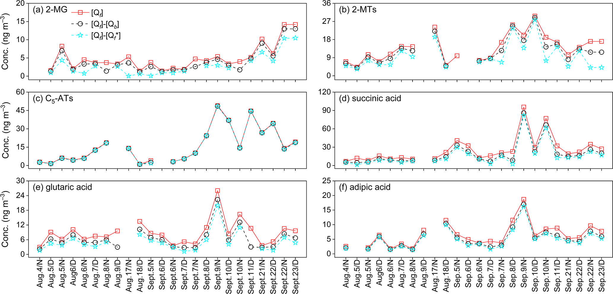 In Sampler II of this study, a third bare quartz filter (Qbb) was added after Qf and Qb, and the B values given in Table 2 also reflect the relationship between the amounts of gaseous WSOMMs adsorbed on two consecutive quartz filters. As such, it is more appropriate to estimate the amounts of gaseous WSOMMs adsorbed on Qf ([Qf*]) by assuming that the B value of Qf and Qb ([Qb]/([Qf*]+[Qb])) is identical to that of Qb and Qbb. In this case, the artifact-corrected particulate concentrations of the WSOMMs can be calculated as [Qf]-[Qf*]. As Fig. 4 shows, the [Qf], [Qf]−[Qb], and [Qf]-[Qf*] values of all six species have similar time series. However, except for C5-ATs, the mean [Qf] and [Qf]−[Qb] values of 2-MG, 2-MTs, and dicarboxylic acids are 33.8 %–78.1 % and 11.1 %–40.3 % higher than that of [Qf]-[Qf*]. Since the volatilization of particulate WSOMMs in Qf samples was not known, the values of [Qf]-[Qf*] can be regarded as a lower limit for filter-based measurements of particulate WSOMMs.