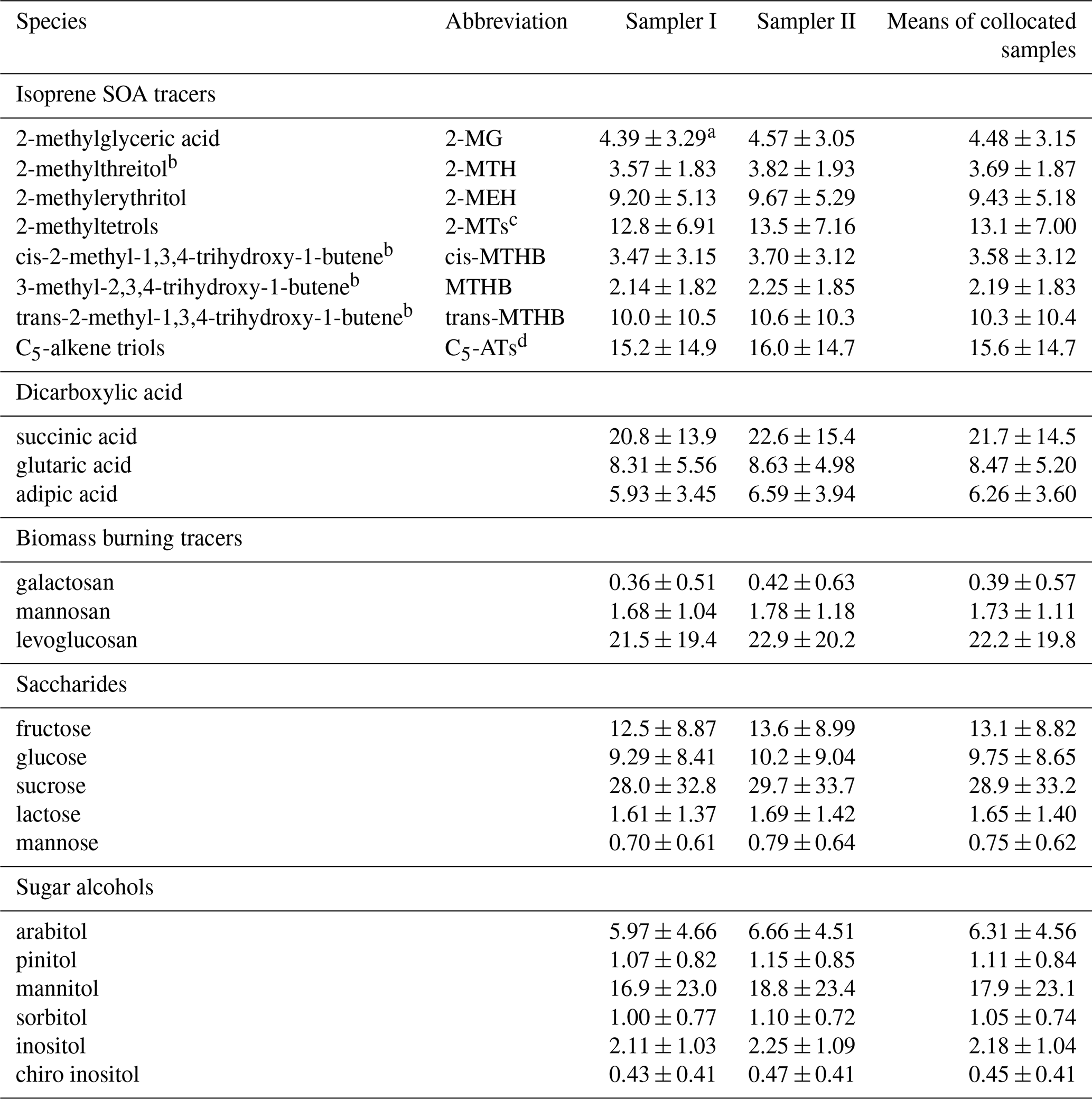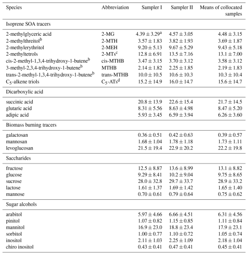 Table 4Comparisons of the mean concentrations (ng m−3) of isoprene SOA tracers and dicarboxylic acids in the Qb and KOH-treated Qbb samples from Sampler I and the collocated untreated samples from Sampler II.