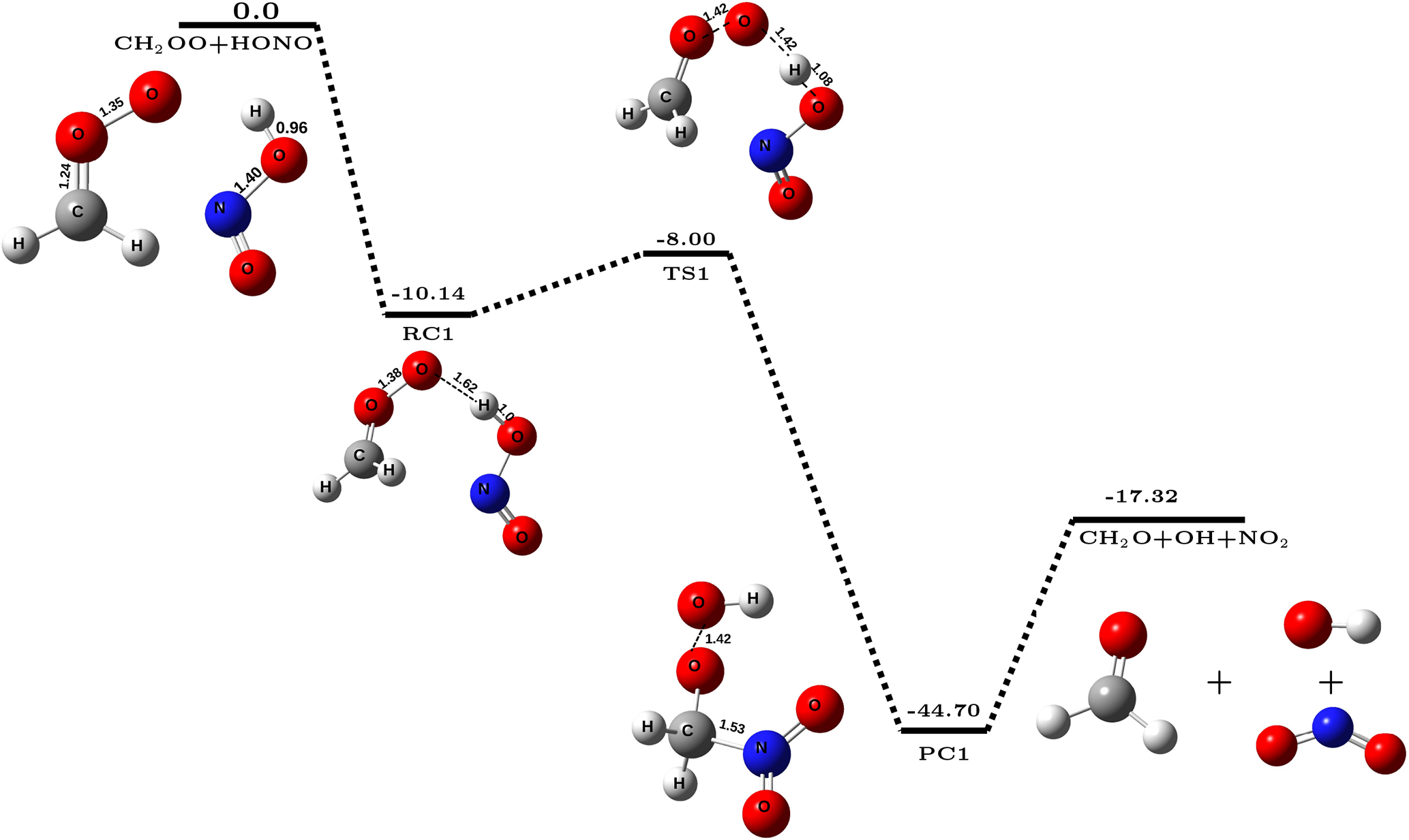 In the present work, we have investigated the reactions of Criegee intermediates (CIs) with nitrous acid (HONO). It is known that the reactivity of CI is greatly influenced by the substitution group present on carbon center of the CI. Therefore, to account for it, we have studied two types of CIs; the simplest Criegee intermediate (CH2OO) and the dimethyl-substituted Criegee intermediate ((CH3)2COO). Another motivation for choosing (CH3)2COO comes from the fact that in contrast to simple Criegee which is formed only from the ozonolysis of ethene, the dimethyl-substituted Criegee intermediate can be generated from the ozonolysis of many highly abundant alkenes, such as terpenes and mycrene, and hence, the concentration of (CH3)2COO is significantly higher in the atmosphere. In this section, we will first discuss the energetics and kinetics of CH2OO + HONO reaction, followed by (CH3)2COO + HONO reaction. The potential energy surface for CH2OO + HONO reaction is depicted in Fig. 1. It is evident from Fig. 1 that reaction occurs in three steps; in the first step, CH2OO interacts with H atom of HONO via hydrogen bonding and forms a stable reactant-complex (RC1), which is ∼ 10.1 kcal mol−1 stable than isolated reactants. In the next step, RC1 undergoes a unimolecular transformation to form product-complex (PC1) which has stabilization energy of kcal mol−1 with respect to the isolated reactants. This happens via a transition-state (TS1) that is effectively ∼8.0 kcal mol−1 below the isolated reactants. In the last step, PC1 undergoes unimolecular dissociation to form final products, i.e., CH2O, OH•, and NO2. Gibbs free energy at 298 K associated with this conversion of PC1 to isolated products is kcal mol−1 (Sect. S4), which suggests that the formation of OH• via CH2OO + HONO reaction is a spontaneous process.