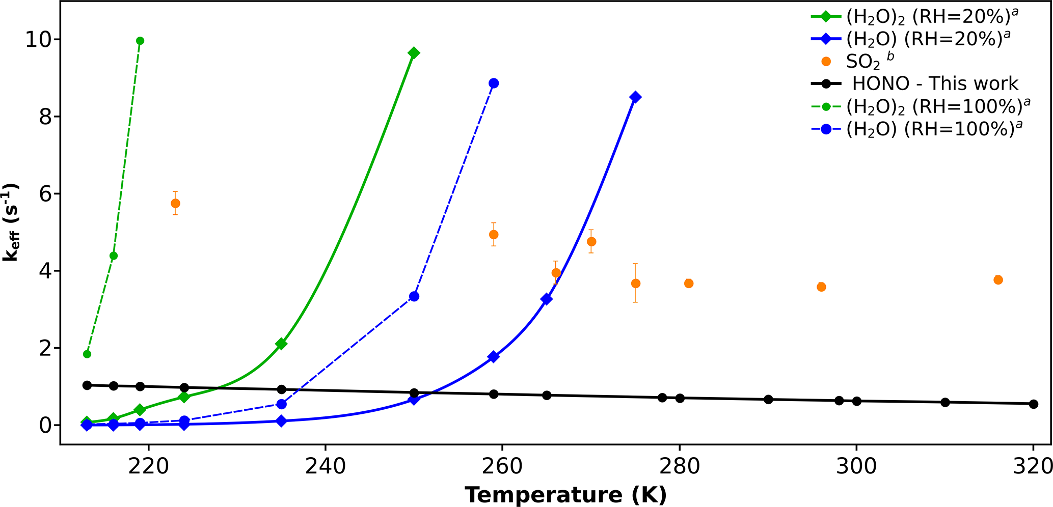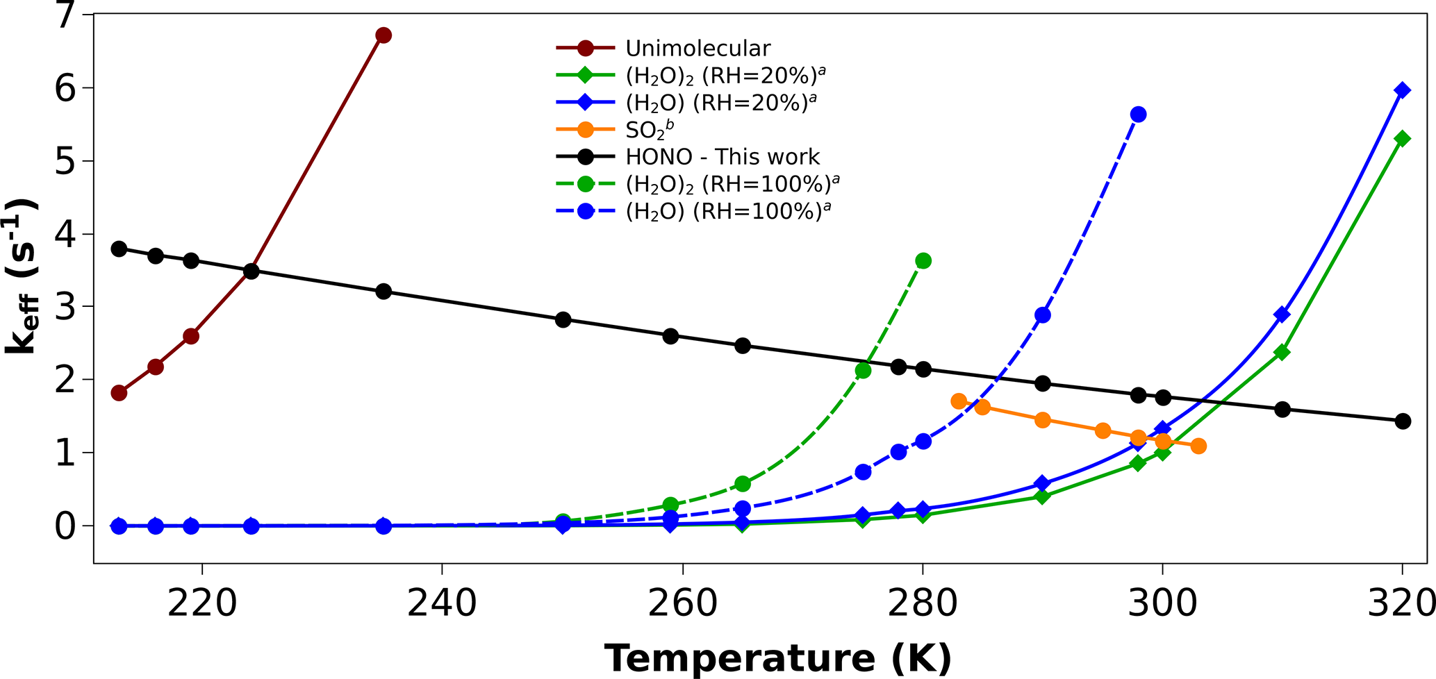 Figure 4Effective rate constant comparison (keff, in s−1) of (CH3)2COO + HONO with the keff of previously known sinks of (CH3)2COO. (a) Values are taken from reference (Vereecken et al., 2017). (b) Values are taken from reference (Smith et al., 2016).
