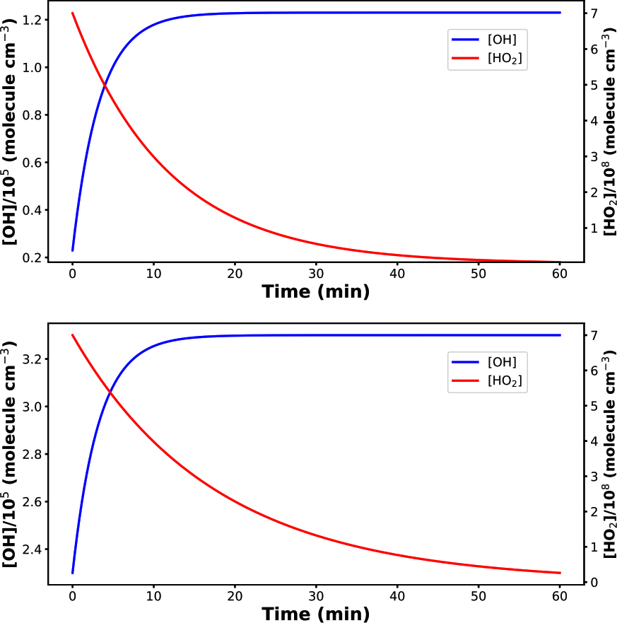 Figure 5Top panel: Concentration profiles of HO and OH• using CH2OO + HONO reaction into the model. Bottom panel: Concentration profiles of HO and OH• using (CH3)2COO + HONO reaction into the model.