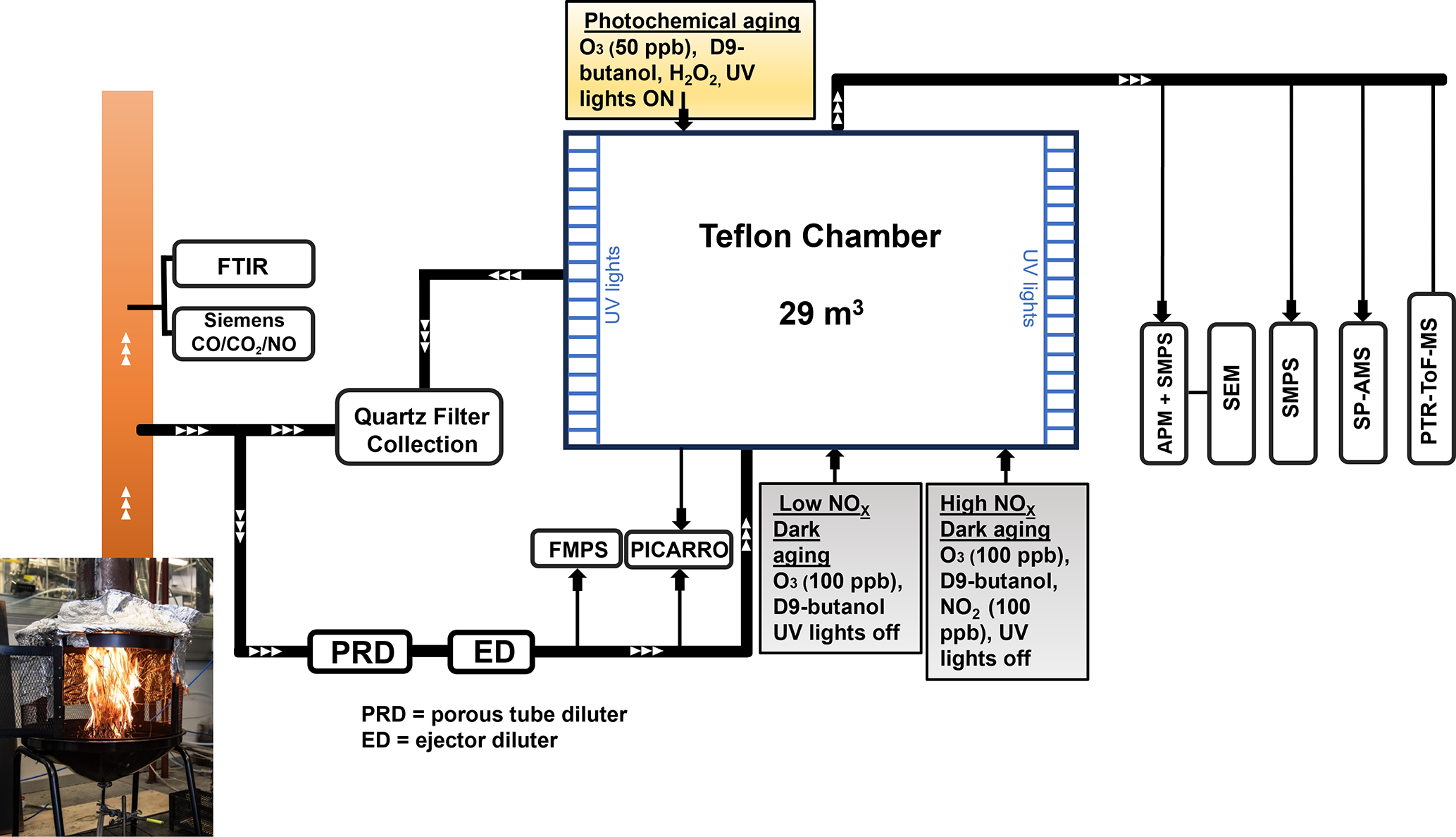 The particle size distributions were measured from the environmental chamber for the whole duration of each experiment by a scanning mobility particle sizer (SMPS) consisting of a differential mobility analyzer (DMA, model 3080; TSI Inc.) and a condensation particle counter (CPC, model 3775; TSI Inc.). In addition, an aerosol particle mass analyzer (APM, model 3602; Kanomax Inc.) in tandem with another SMPS (with DMA 3081 and CPC 3750, TSI Inc.) was used to measure the size distribution of mass classified particles to estimate the size-resolved effective densities of the particles (Leskinen et al., 2023; Mukherjee et al., 2024). Particle densities of primary emission from the chamber were measured before the application of any additional reactants to the chamber. The density of the aged particles in the chamber were measured 4.5 h after the addition and stabilization of the reactants (for dark aging) and/or turning on of the UV lights (for photochemical aging; Table S4). Simultaneous to the density measurements, particles were collected on holey-carbon grids (S147-4 Holey carbon film 400 Mesh Cu; Agar Scientific Inc.) from the chamber using an aspiration sampler at a flowrate of 0.3 L min−1. Subsequently, we performed Scanning Electron Microscopy (SEM, Sigma HD/VP; Carl Zeiss NTS) to investigate the morphology of both chamber diluted primary and aged BB emitted particles.