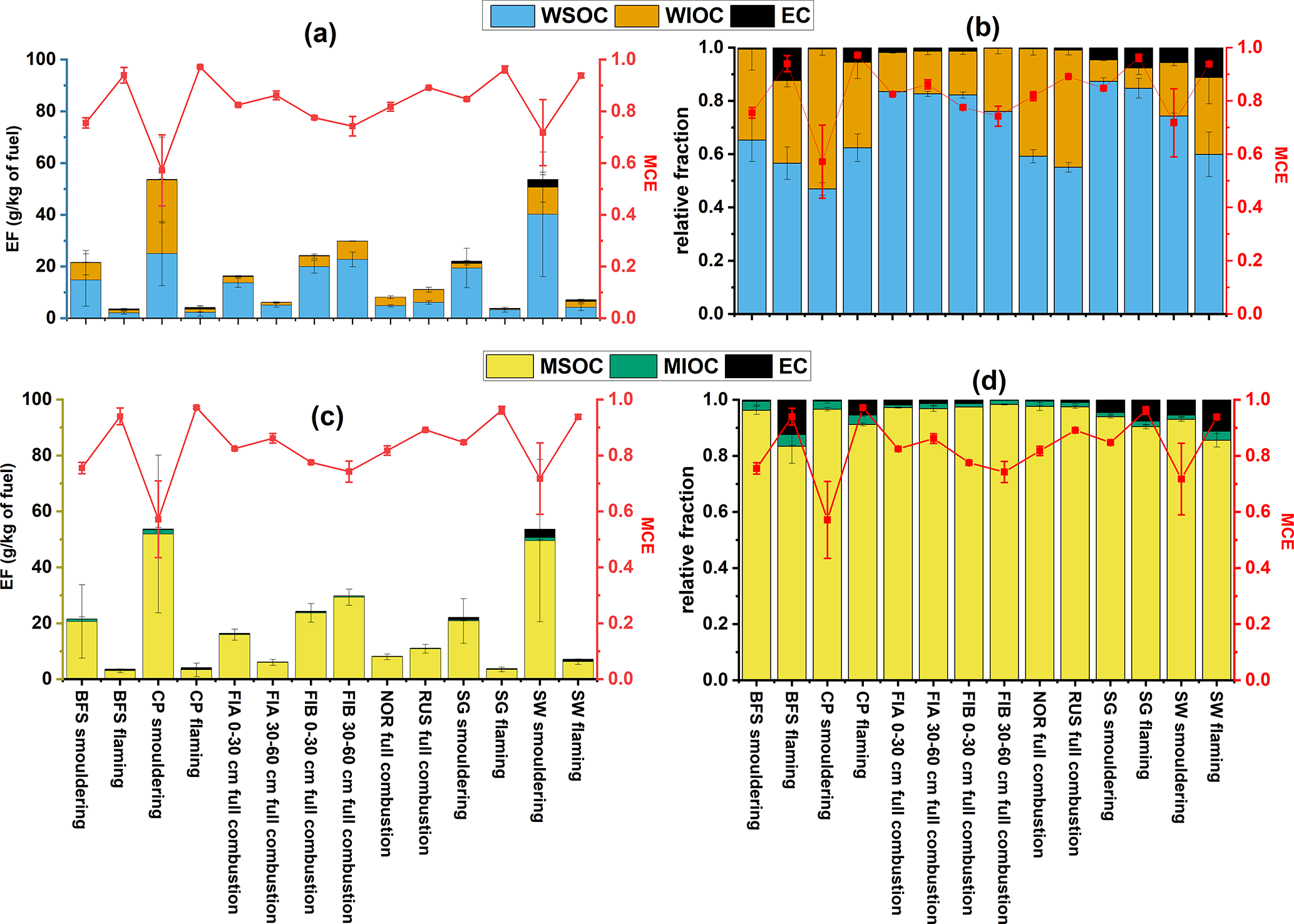 Figure 2Emission factors of water-soluble (WSOC), MeOH soluble (MSOC), water-insoluble (WIOC), MeOH insoluble organic carbon (MIOC) and elemental carbon (EC) in absolute scale (a, c) and relative to total EF (b, d).