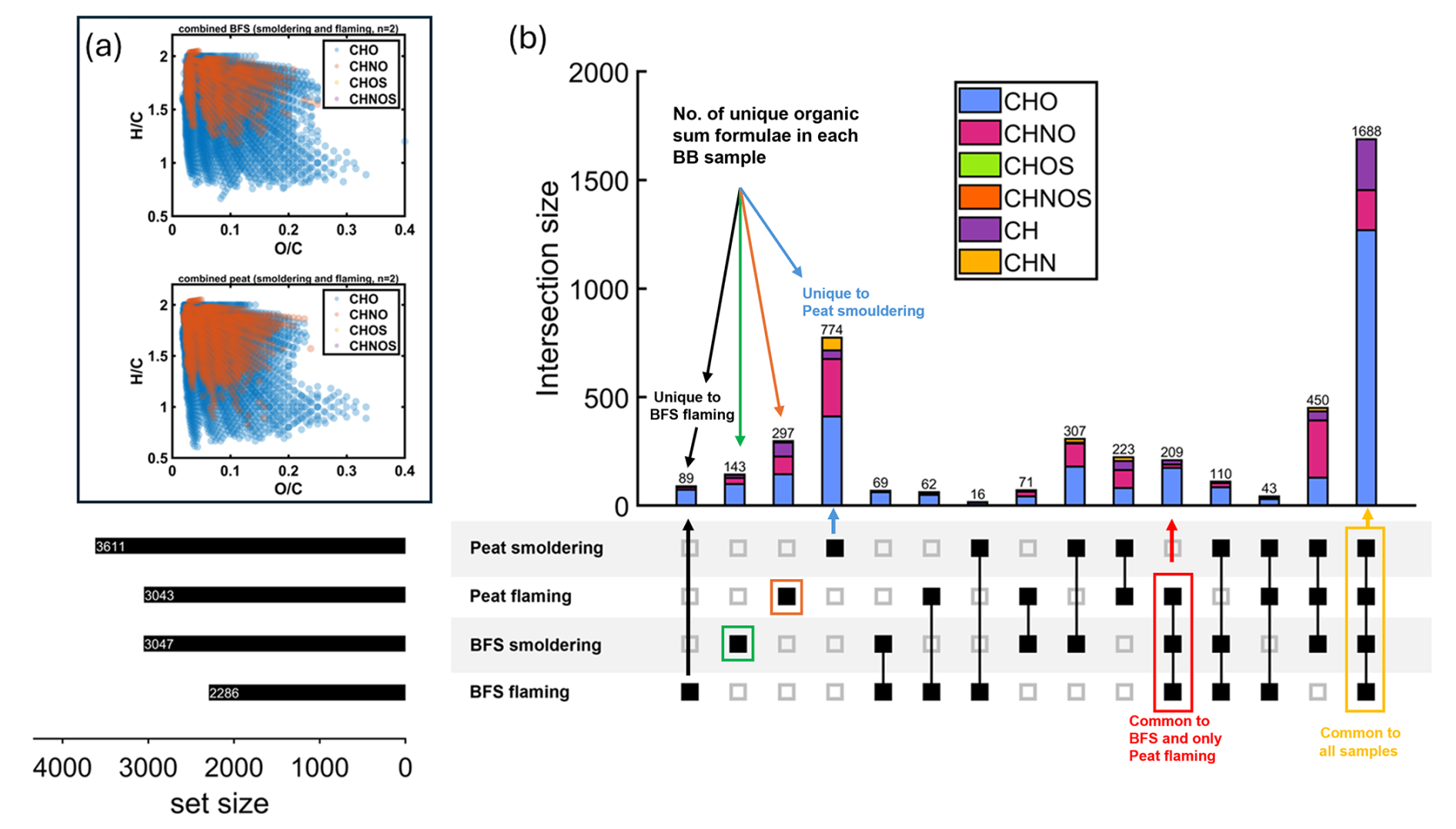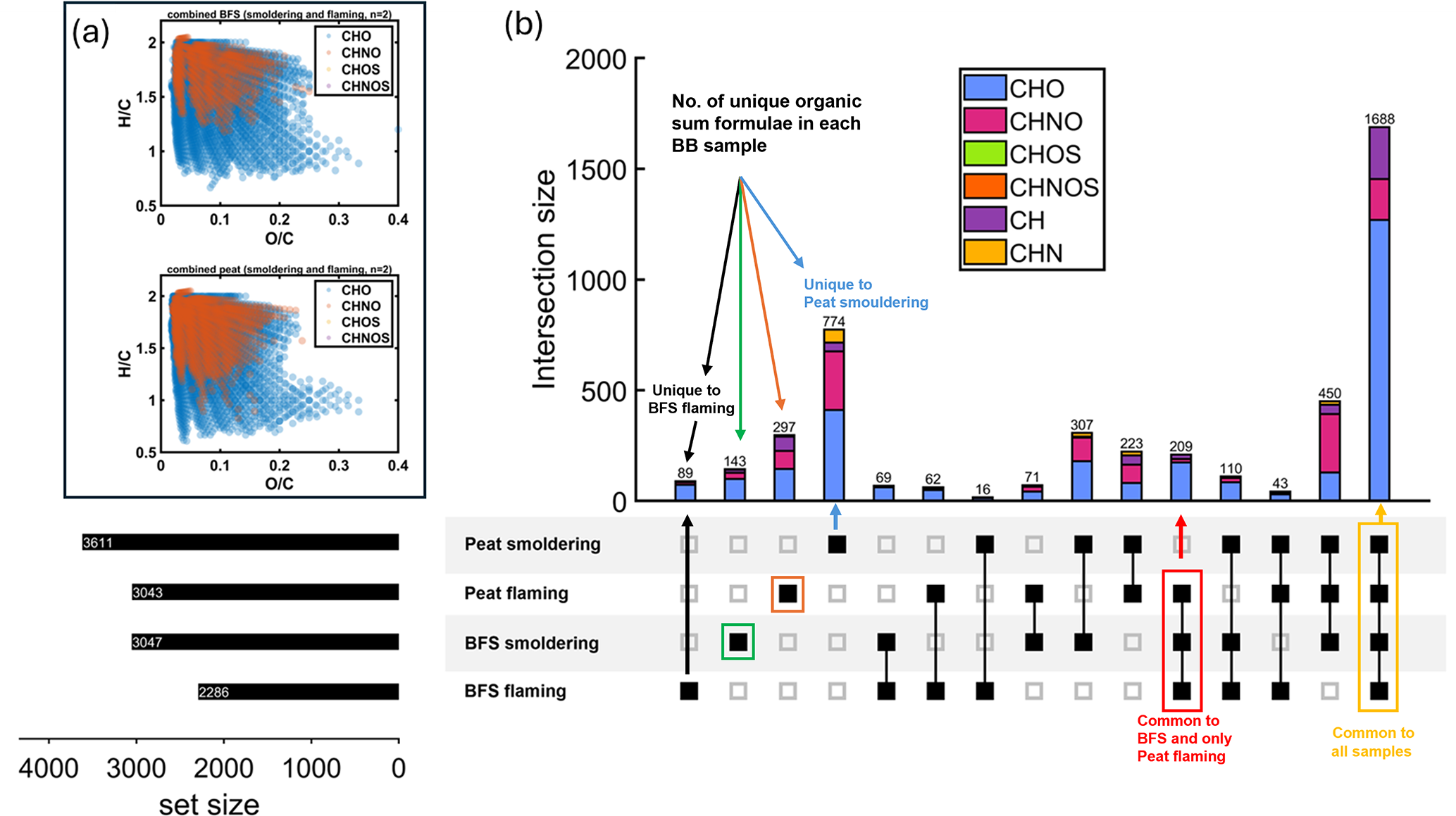 Figure 3(a) Van-Krevelen diagrams of oxygen-containing compounds and (b) upset plot intersections (combined CP and BFS) with compound class indicated by colour. Samples were analysed by positive-ion DIP-APCI FT-ICR mass spectrometry. Upset plot of four organic aerosol datasets (flaming and smouldering emissions of CP and BFS) with the number of measured molecular formulae in each dataset (bottom left) and the individual intersections (top right) indicated by colour (CHO-light blue, CHOS-green, CH-purple, CHNO-magenta, CHNOS-orange and CHN-yellow). The compared samples are shown in the lower right corner and the common organic sum formulas they contain in the panel on the upper right.