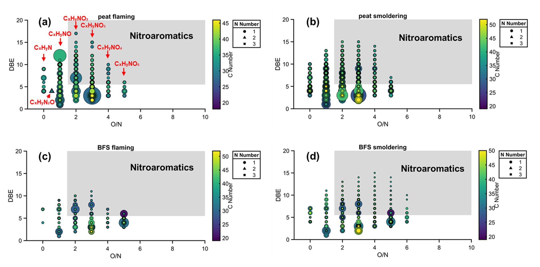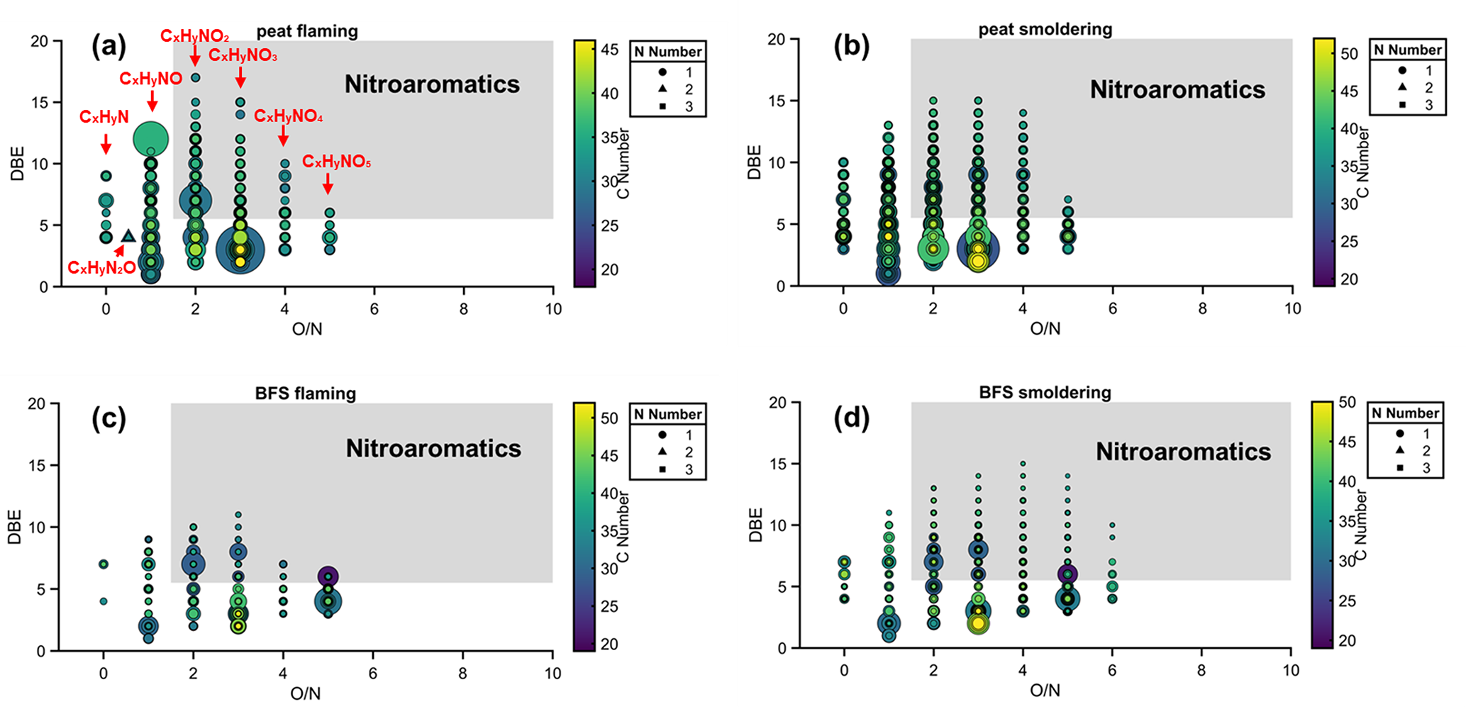On the other hand, the BFS smouldering and flaming emissions exhibited chemically similar compounds, with nearly 1900 identified molecular formulae shared among all the analysed BFS samples. Almost none of the molecular formulae were unique to BFS smouldering or flaming samples, as the variability among replicates themselves was high. This indicates that although different combustion conditions of BFS strongly influence the OC emission factor, it does not lead to prominent chemical differences in POA. Similar to CP, BFS emissions were also dominated by CHO, CHNO and CH classes, although a much lower fraction of CHN was present in the BFS smouldering emission compared to CP. Furthermore, a more detailed inspection of the identified formulae of the nitrogen-containing molecules in the fresh CP and BFS emissions reveals that they mostly belonged to the CHNO class, contained one nitrogen substitution, and consisted of both aliphatic and aromatic nitro-organic compounds (Fig. 4). Specifically, nitroaromatics were more abundant in the peat samples, which is relevant, as nitroaromatics are known to be prominent BrC chromophores absorbing light in the wavelength range of 360–600 nm (Fleming et al., 2020).