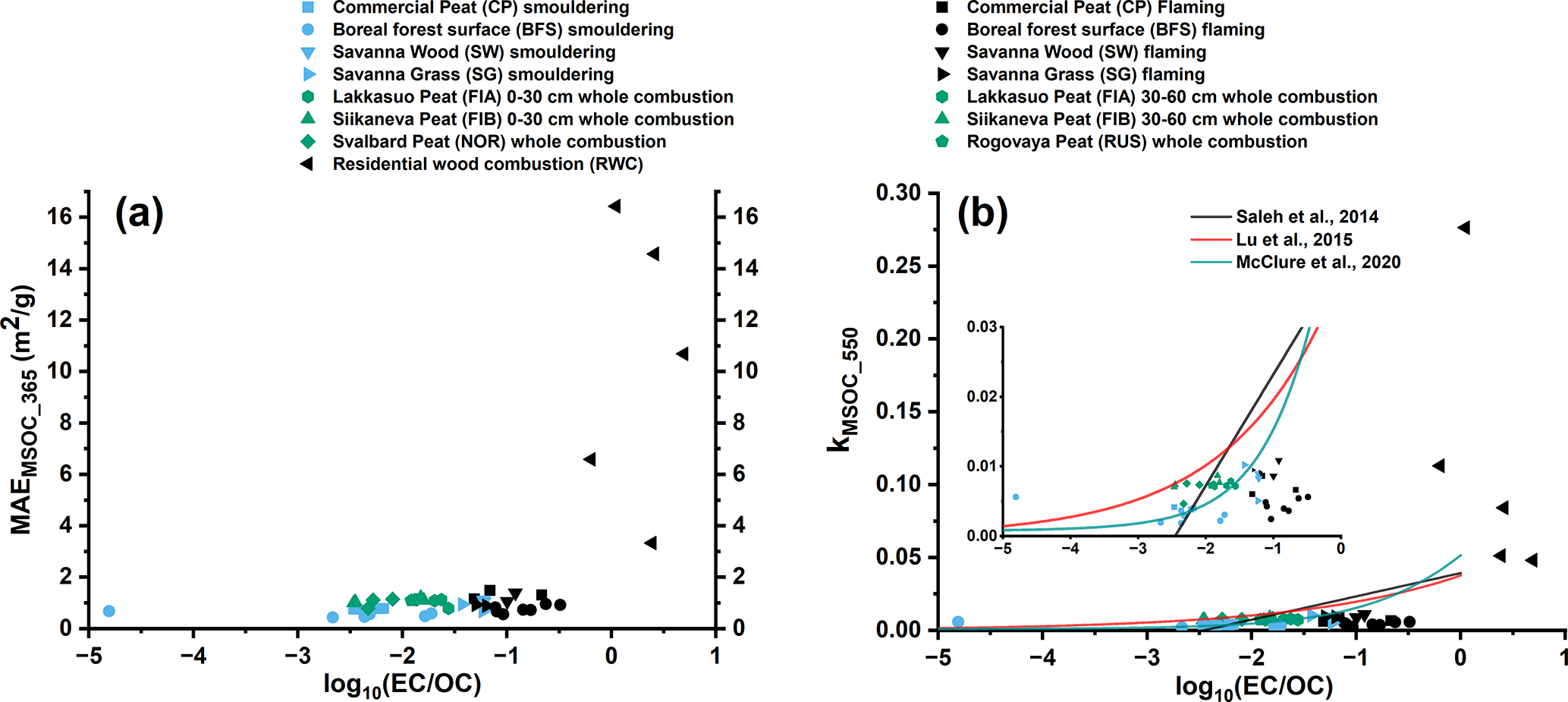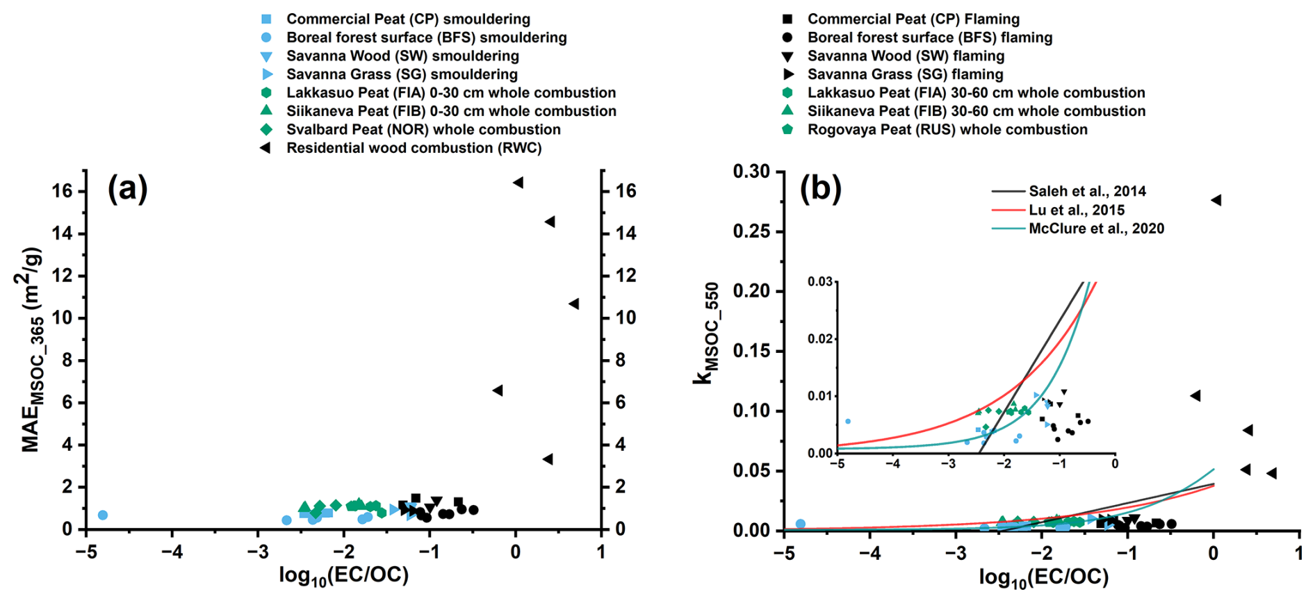BB is a dynamic and variable process that strongly depends on fuel moisture content, fuel composition and combustion conditions. A common parameter to characterize BB is the modified combustion efficiency (MCE), which describes the share of carbon dioxide to the sum of CO and CO2 emissions. However, studies have typically found only weak correlations between BrC light absorption and MCE (Pokhrel et al., 2016; McMeeking et al., 2014). The ratio of the emitted BC (mainly composed of elemental carbon or EC structures) to the organic carbon (OC) has been suggested as a more suitable parameter for correlating the aerosol optical properties with combustion conditions (McClure et al., 2020; Stockwell et al., 2016; Saleh, 2020). For instance, flaming dominated combustion processes generally lead to relatively high ratios and more absorptive BrC than smouldering emissions (Saleh et al., 2014; Xie et al., 2018; McClure et al., 2020; Kumar et al., 2018).