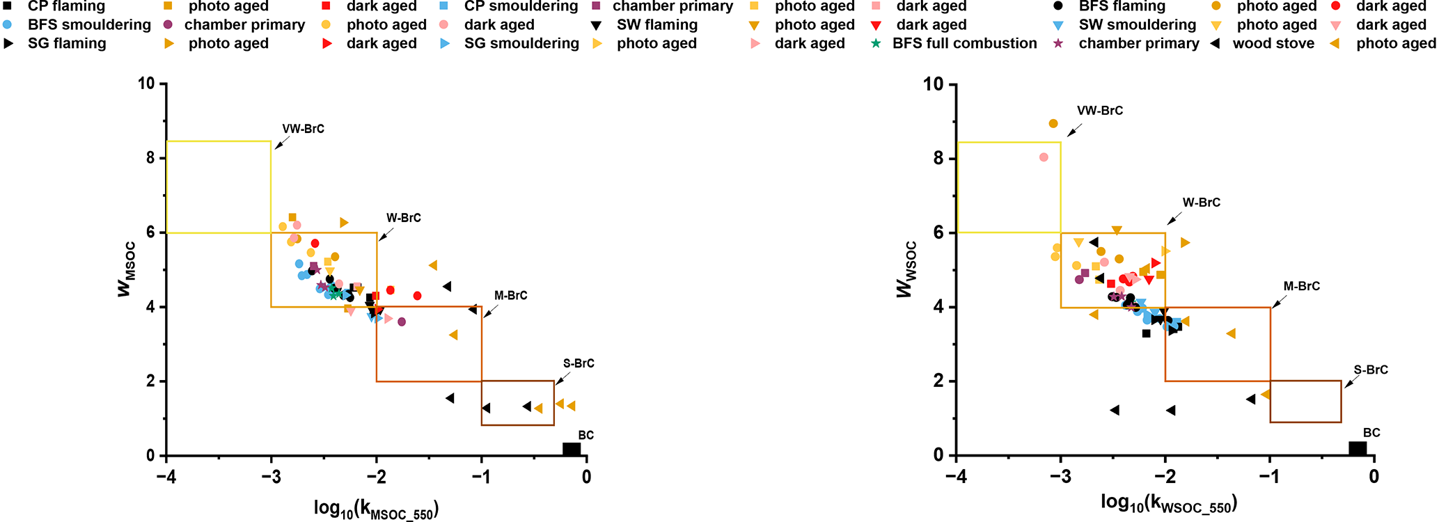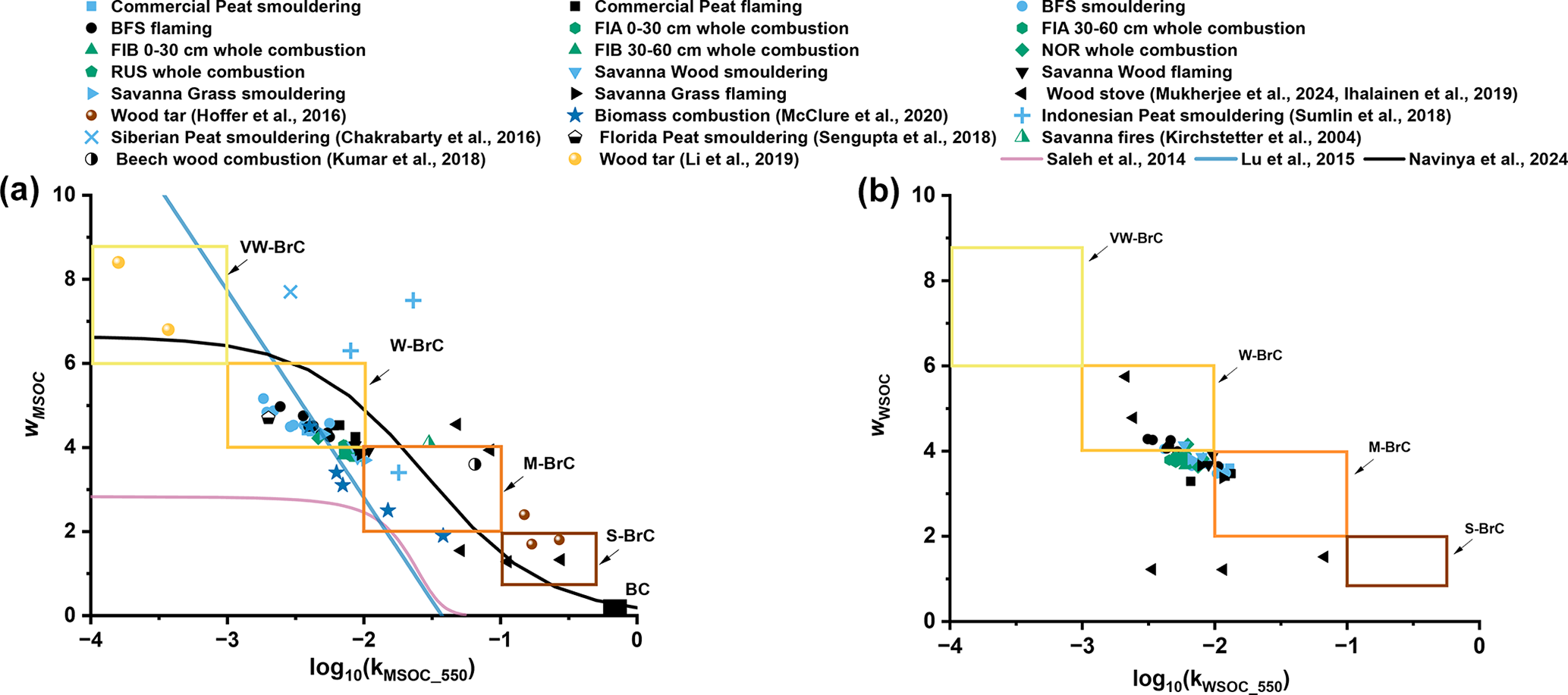 In climate models, the light absorption strength of the material is described by the imaginary part of the refractive index (k). For pure BC, k are constrained close to unity and exhibit very little to no wavelength dependence, especially at UV and shorter visible wavelengths (Bond and Bergstrom, 2006). However, the k for BB emitted BrC seem to vary across several orders of magnitude depending on the biomass type and combustion conditions as well as the measurement techniques (Chakrabarty et al., 2010; Bluvshtein et al., 2017; Saleh et al., 2018; Saleh, 2020; Navinya et al., 2024). Therefore, characterizing the k for individual BrC compounds is a daunting and, in some cases, impossible task due to instrumental limitations. A more comprehensive approach has been adapted in the last decade where the k values for BB derived BrC has been shown to fall in a “brown-black carbon continuum” (Saleh et al., 2018). BB derived BrC generally exhibit progressively higher k values with increasing temperature and has been termed as “dark BrC (d-BrC)” (Hoffer et al., 2017; Adler et al., 2019; Atwi et al., 2022; Chakrabarty et al., 2023) or “strongly absorptive BrC (s-BrC)” (McClure et al., 2020; Saleh, 2020) when the combustion temperatures approach the BC formation regime. In contrast, the BrC derived from BB combustions in progressively decreasing combustion efficiency and temperature has been termed as “moderately absorptive (M-BrC)”, “weakly absorptive (w-BrC) and “very weakly absorptive (VW-BrC)”, respectively (Saleh, 2020; Moschos et al., 2024), as the k values decrease with lower burning temperature.