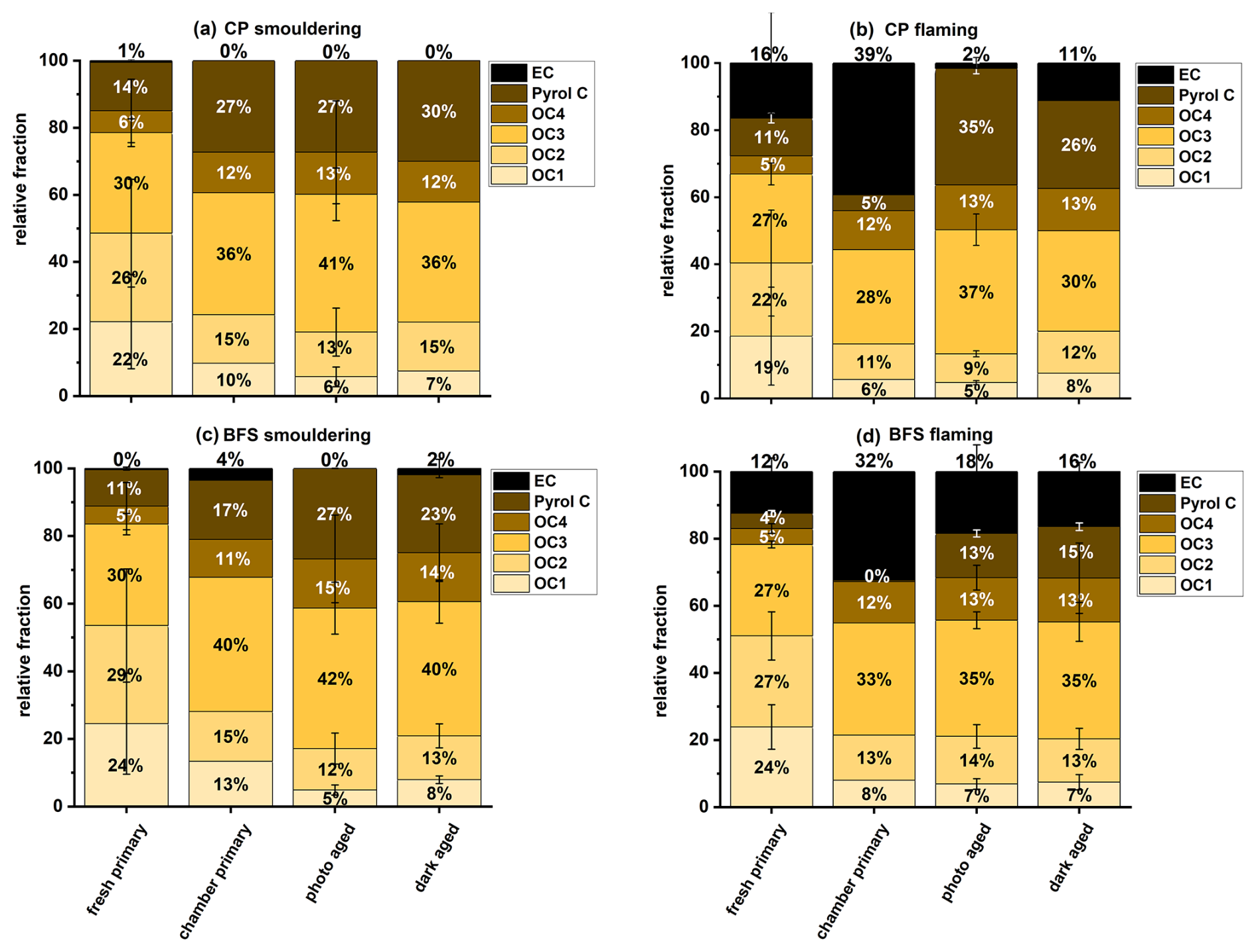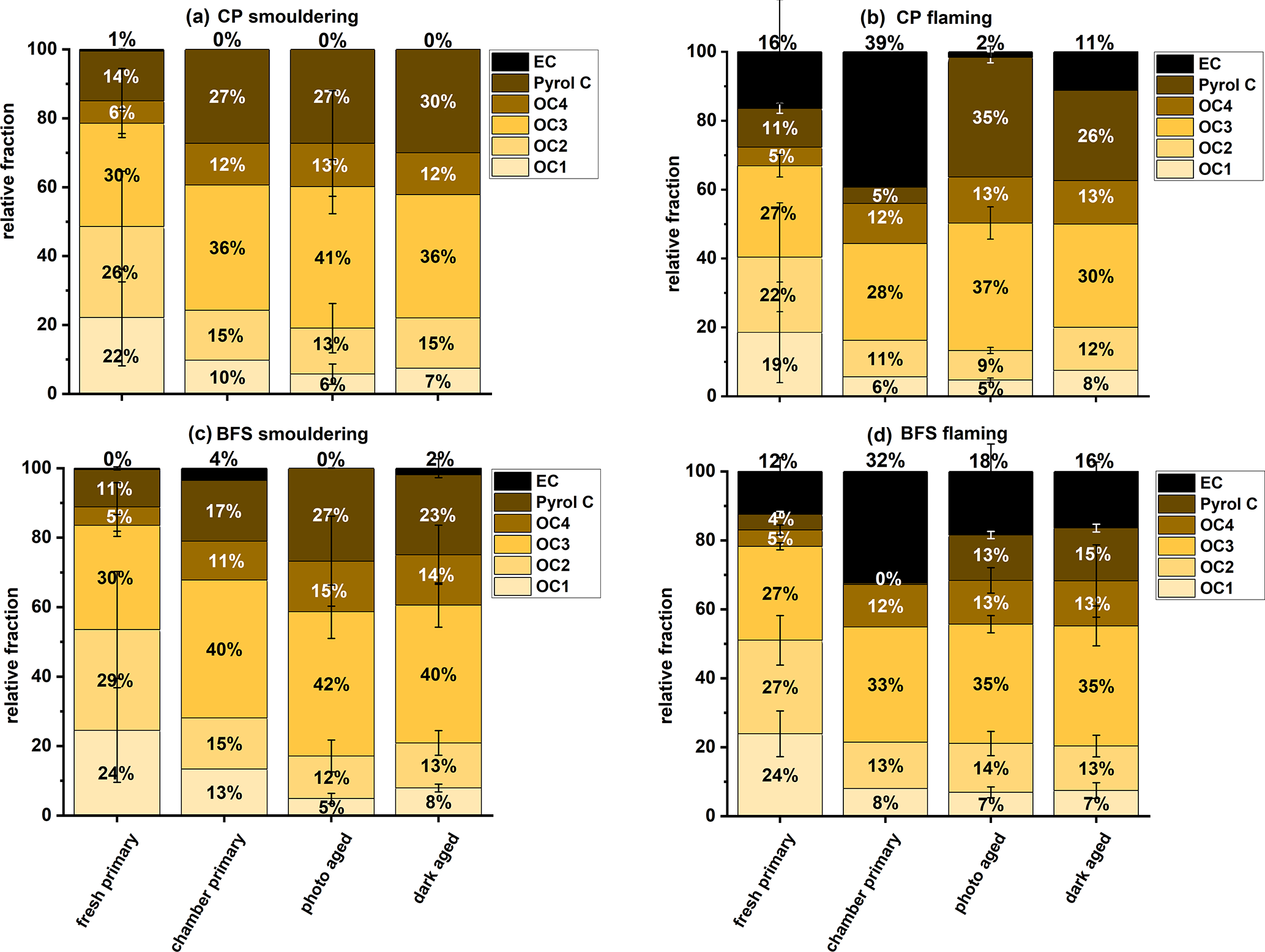 In comparison, for residential wood combustion (RWC) of North European beech wood logs (Mukherjee et al., 2024) the respective average OC and EC emission factors were 0.64(± 0.31) g kg−1 and 0.28(± 0.04) g kg−1. Thus, the OC emission factors for the open burning in the current study were approximately 4–140 times higher for smouldering emissions and 2–13 times higher for flaming emissions than our previous estimates of RWC emission. In comparison, we did not observe such a significant difference between the EC emission factors of RWC and flaming BB emissions. This implies that surface fires have the potential to be important sources of specifically organic pollutants and BrC in forest fire prone environments, whereas the BC emissions would not be particularly high from these fires.