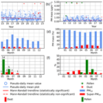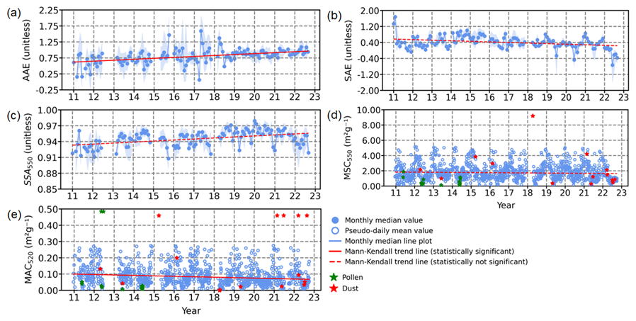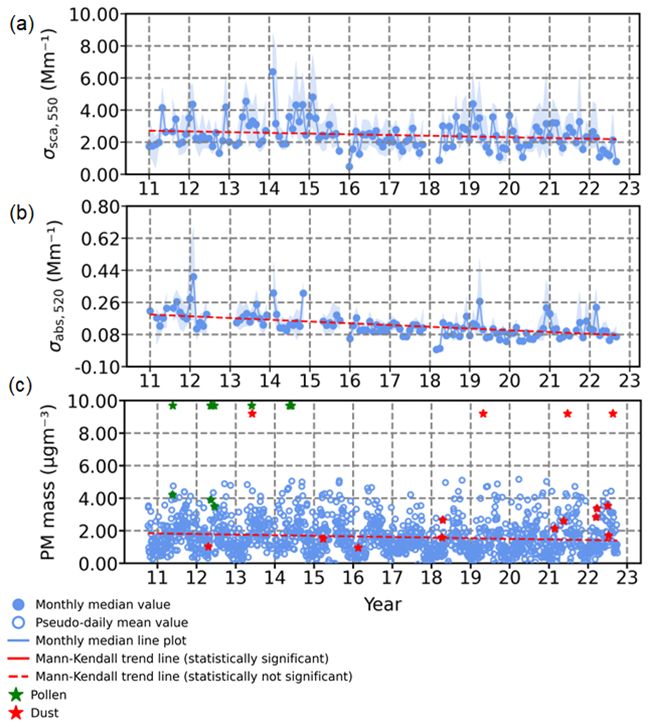 Pollen and dust events (green and red stars; Sect. 2.3) introduce additional short-term variability in the observed optical and mass properties without altering the sign or statistical significance of the long-term trends (Table 3). Pollen events are typically seasonal, occurring during spring and summer, and contribute significantly to particle mass and scattering in the PM1–10 size range. Dust events, which are more intermittent and often result from long-range transport, enhance scattering and mass concentrations in the coarse mode, including PM1–10 aerosol particles. While these events introduce short-term variability, they do not alter the overall long-term declining trends. The pseudo-daily mean values used in this analysis help to better highlight such events by providing a finer temporal resolution, enabling the identification of short-term peaks in optical and mass properties alongside the broader trends.