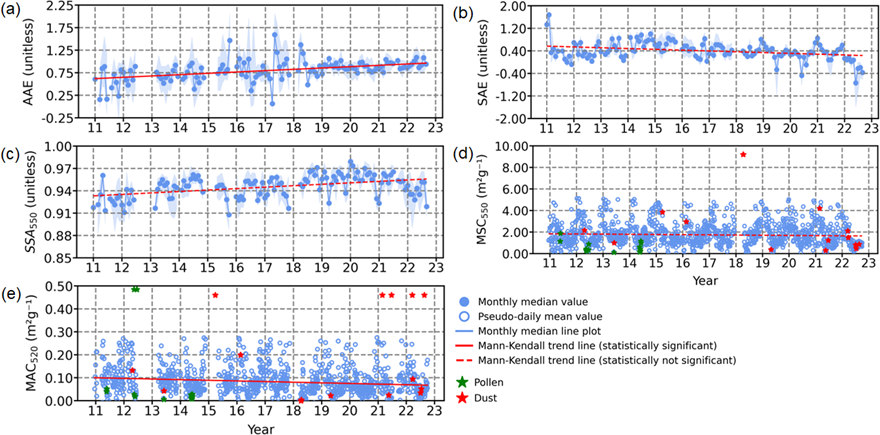 Figure 2Time series of (a) AAE, (b) SAE, (c) SSA550, (d) MSC550, and (e) MAC520 for the PM1–10 aerosol particles from October 2010 to October 2022. The blue shaded area is the interquartile range (25th–75th percentile) of monthly values; the blue line is the monthly median. The red line shows the Theil-Sen trend (solid if p ≤ 0.05; dashed otherwise). Months with < 75 % data coverage are left blank.
